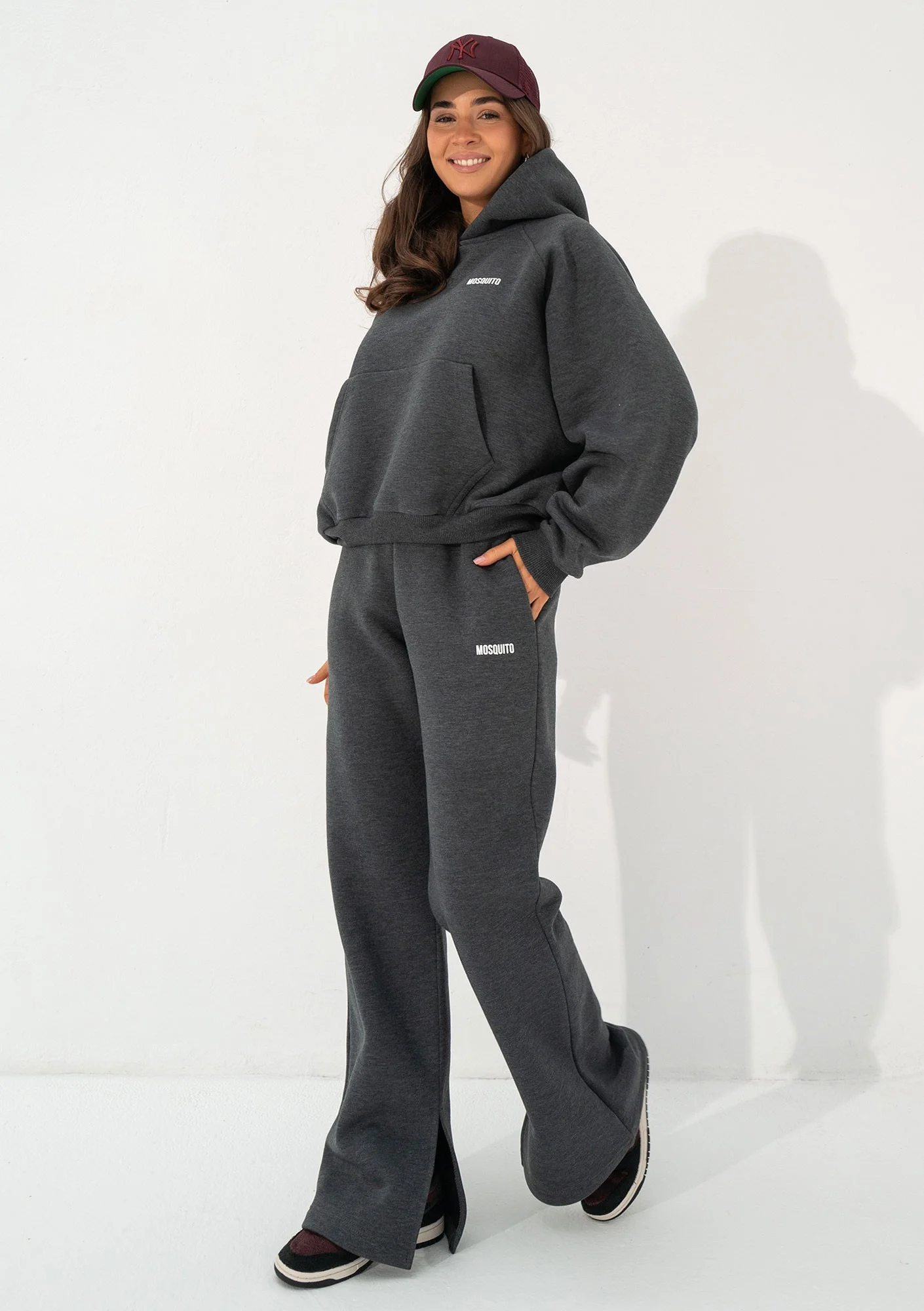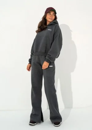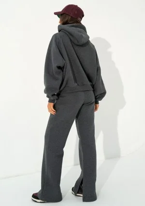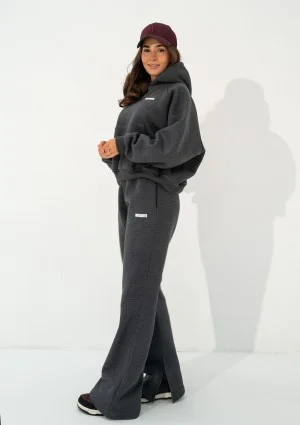 Szare spodnie dresowe w ciemnym, melanżowym odcieniu mają wyjątkowy design. Luźne nogawki są modnie rozcięte, co nadaje im bardzo swobodnego i nieoczywistego stylu. Model Levi został zaprojektowany z myślą o wyższych kobietach, którym trudno jest znaleźć dresy damskie o odpowiedniej dla nich długości nogawek. Modelka Andżelika ma 167 cm wzrostu i prezentuje na sobie rozmiar S.