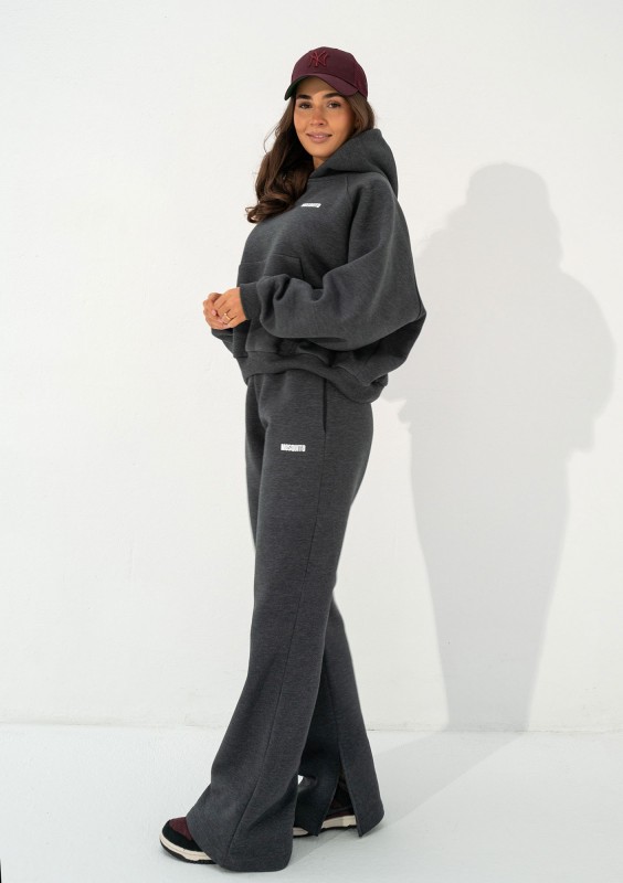 Stylowe spodnie dresowe w grafitowym kolorze. Model z luźną, rozciętą na dole nogawką. Ze względu na długość idealne dla wysokich osób.