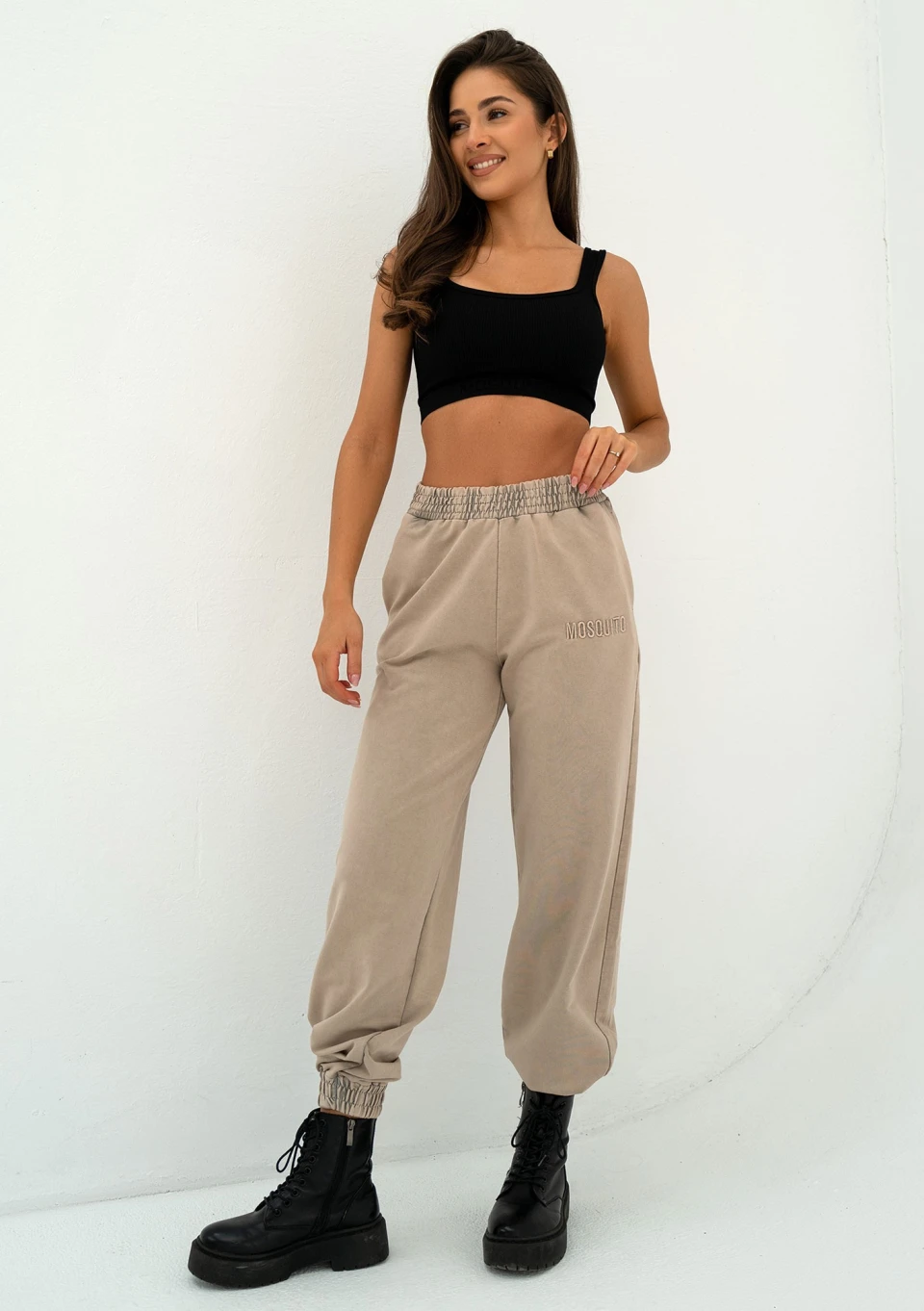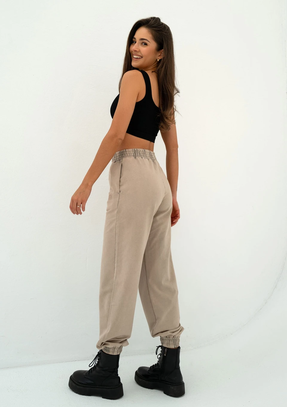 Beżowe spodnie dresowe z efektem vintage, wykończone wygodnymi ściągaczami i wyposażone w praktyczne kieszenie. Dopełnione stylowym logotypem.