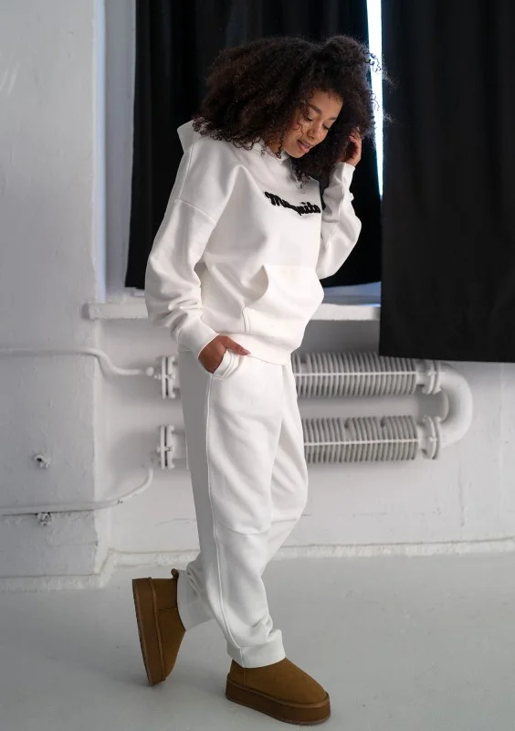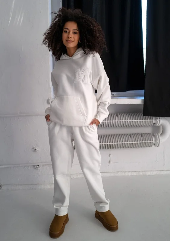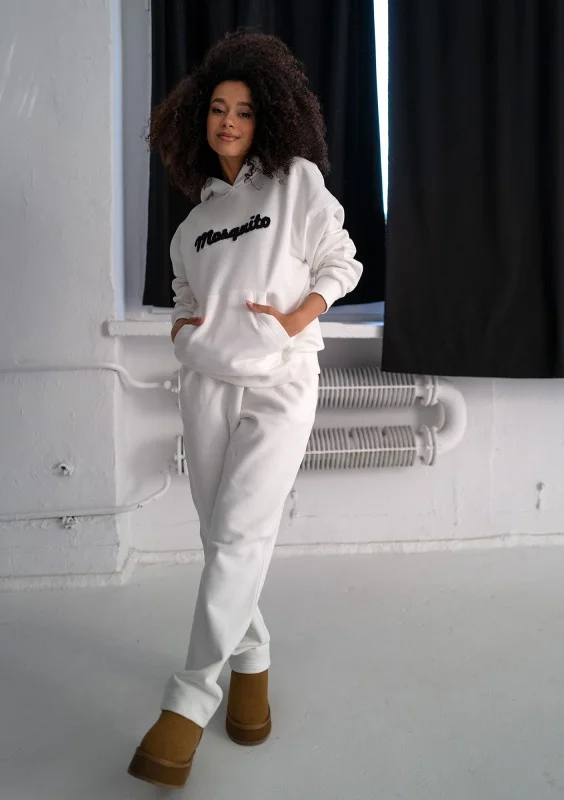 Białe spodnie dresowe damskie z prostymi nogawkami. W pełni wygodne, cieplutkie i przytulne, idealne na chłodniejsze dni.