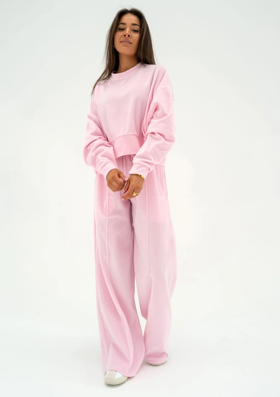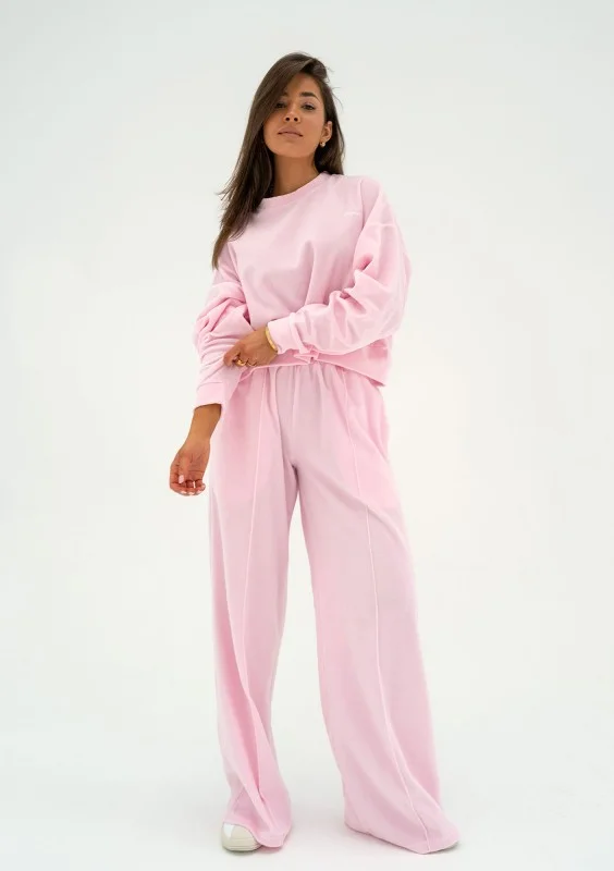 Spodnie dresowe z miękkiego weluru w słodkim, pastelowym odcieniu różu. Prezentowany fason ma najmodniejsze, szerokie nogawki.