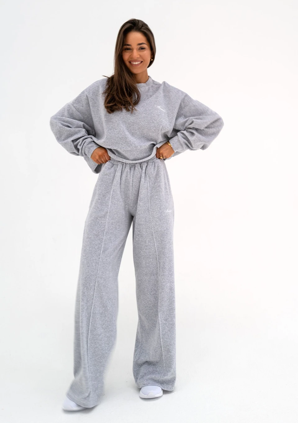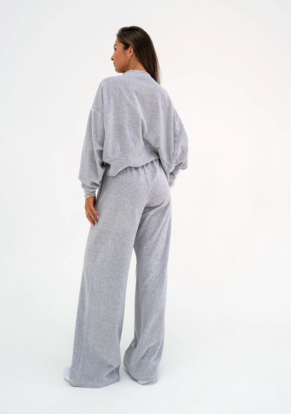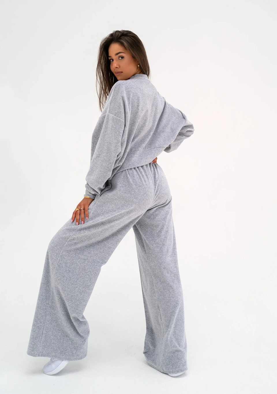 Spodnie dresowe dla miłośniczek miękkiego weluru. Ten fason ma najmodniejsze, szerokie nogawki. Dres wykonany w uniwersalnym, szarym kolorze.