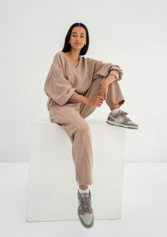 Stylowe spodnie z wyjątkowego, miękkiego jak chmurka materiału z wiskozą w odcieniu beżu latte. Pięknie dopełnią dedykowaną bluzę, tworząc modny i elegancki komplet.