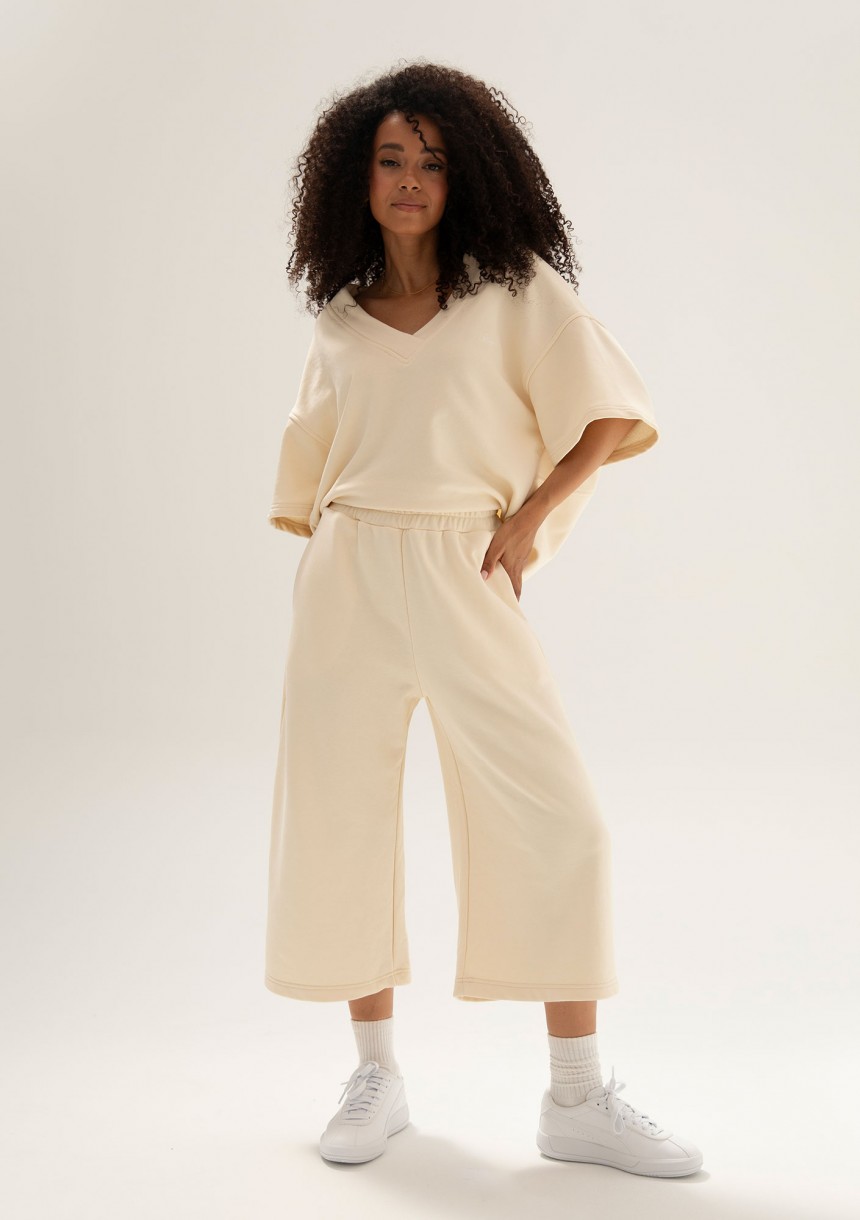 Spodnie damskie culotte są idealne na ciepłe dni. Wybierz nasz model w sportowym stylu, wykonany z bawełny i połącz go z dedykowaną bluzą z krótkim rękawem. Ta uniwersalna i wygodna stylizacja będzie strzałem w dziesiątkę, w pełni praktycznym i sprawdzonym zakupem na wiele okazji i wyjść. Postaw na komplet w jasnym, maślanym odcieniu, do którego wystarczą lekkie sneakersy w dowolnym kolorze.