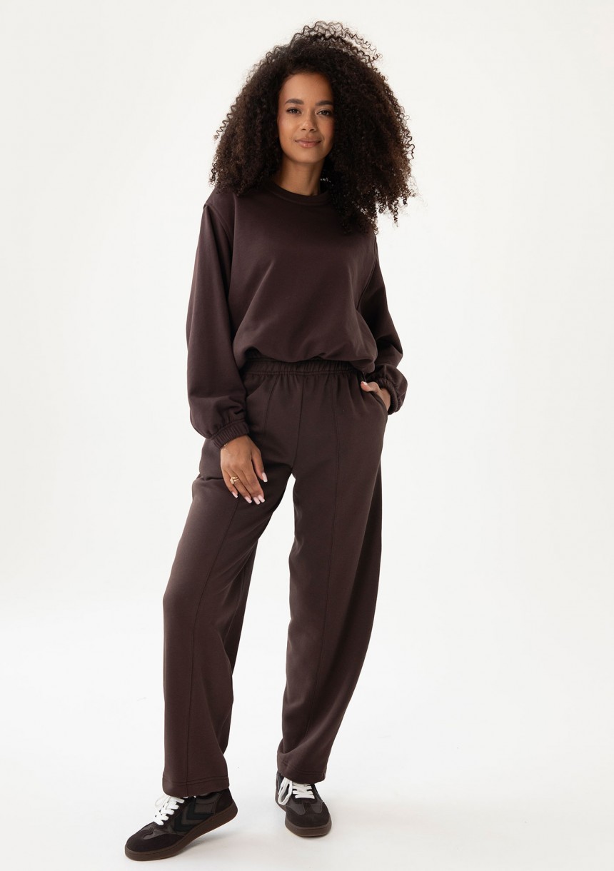 Spodnie dresowe dedykowane bluzie Puff, wykonane w ciemnym, brązowym kolorze. Fason z luźną nogawką i przeszyciami.