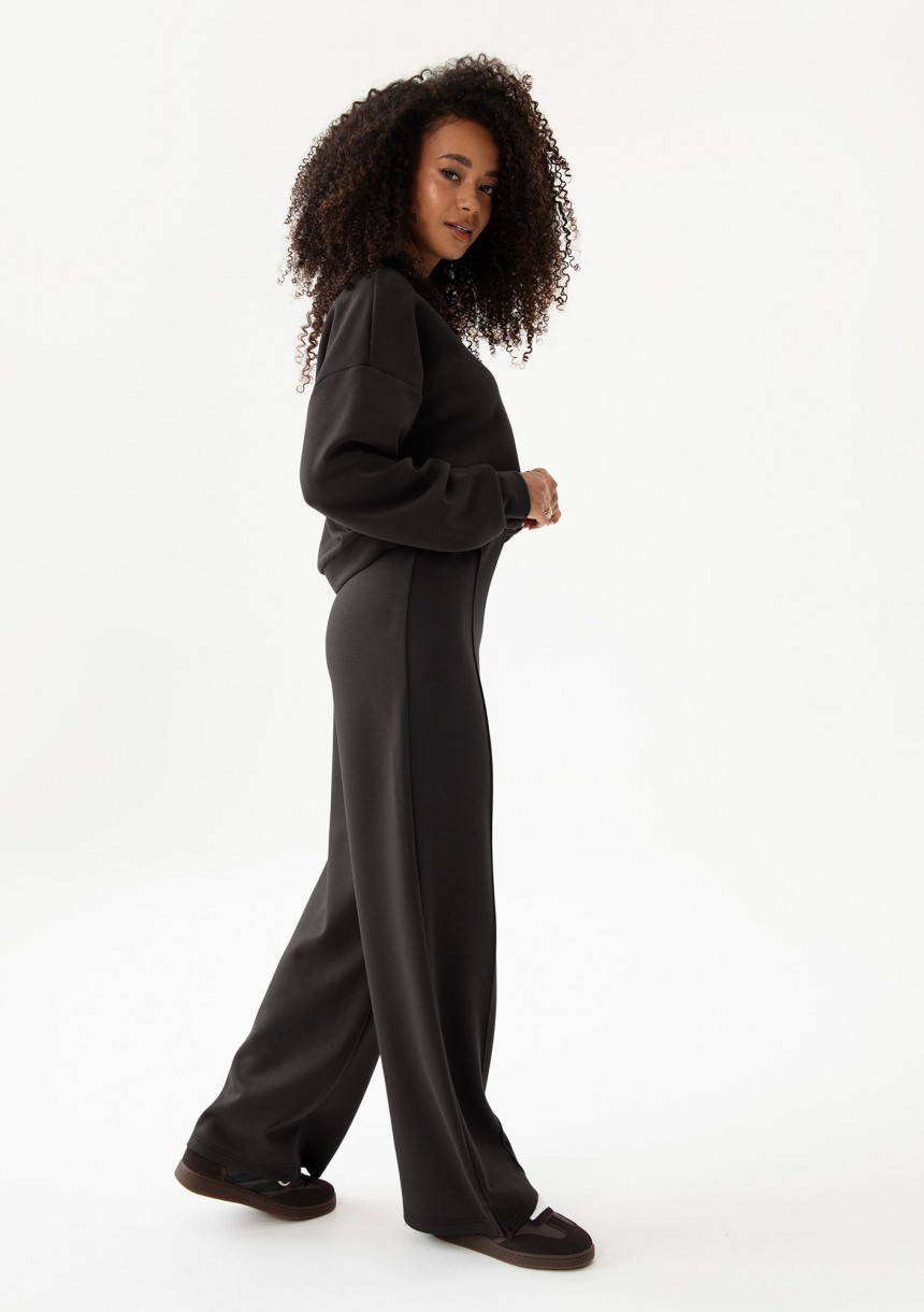 Uniwersalne, casualowe spodnie damskie z miękkiej dzianiny z wiskozą. Fason ma przeszycia i wygodne, szerokie nogawki. Model w klasycznej czerni.