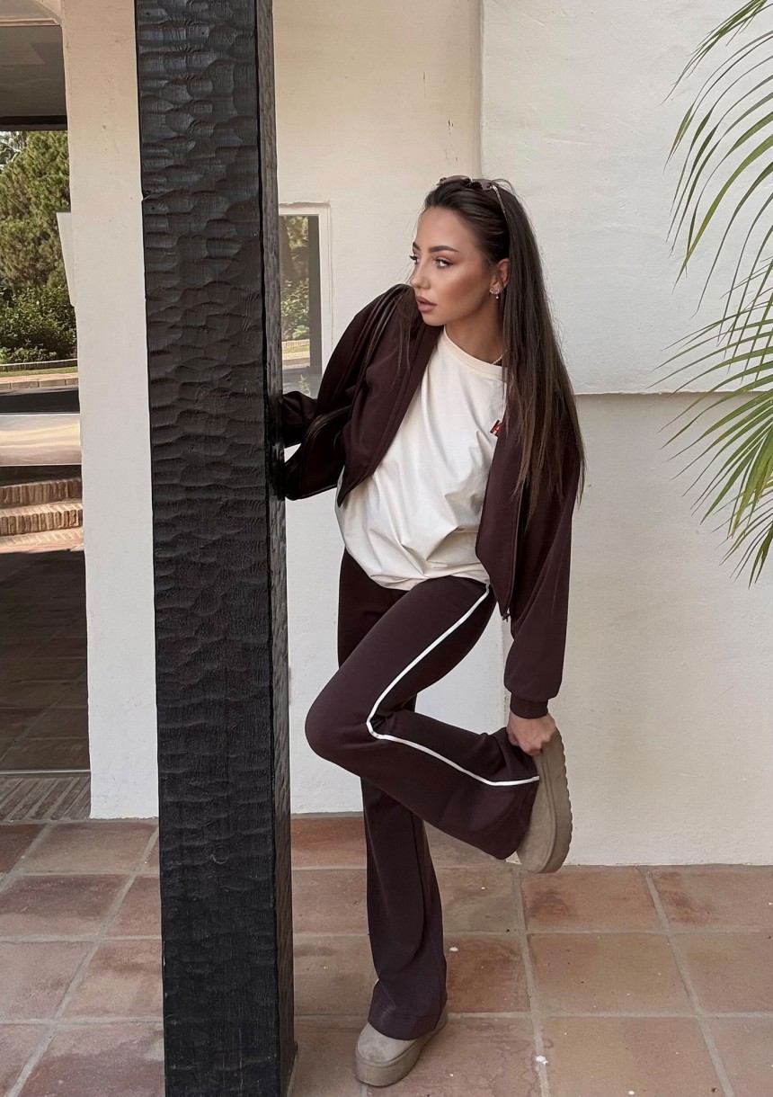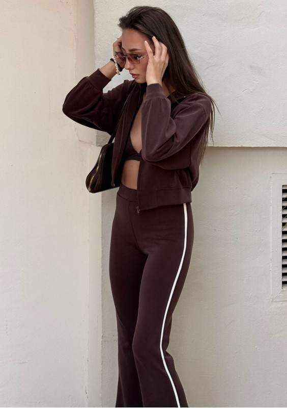 Modne spodnie dresowe z wygodnego materiału o dopasowującej się formule. Świetnie podkreślają sylwetkę! Model w brązowym kolorze.