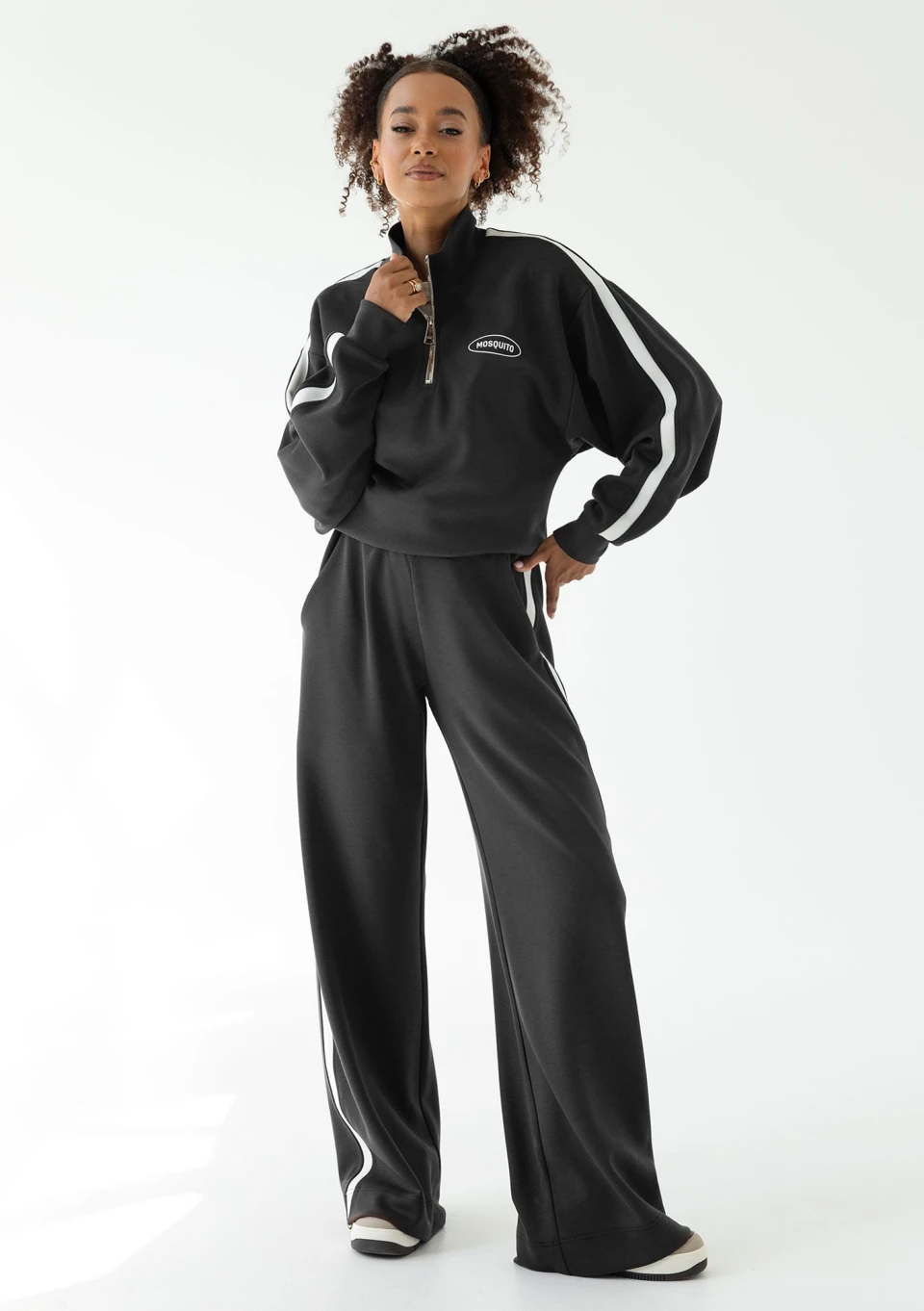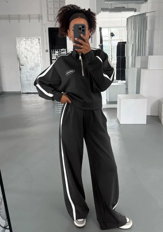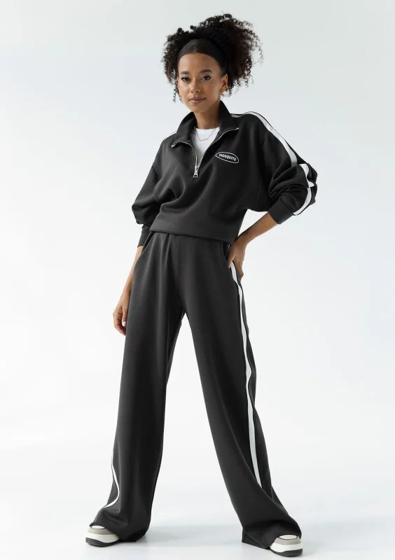 Stylowe spodnie dresowe dla miłośniczek modnych, szerokich nogawek i modnych lampasów. Ten model jest z wyjątkowego materiału z dodatkiem modalu.