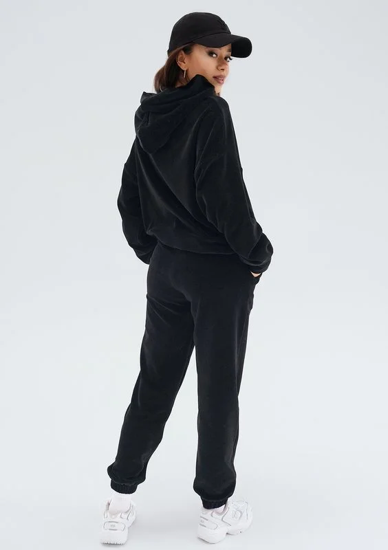 Czarne spodnie dresowe o bardzo luźnym kroju. Model wykonany z modnej dzianiny welurowej. Fason z wygodnymi gumami w pasie i kostkach oraz dwoma kieszeniami.