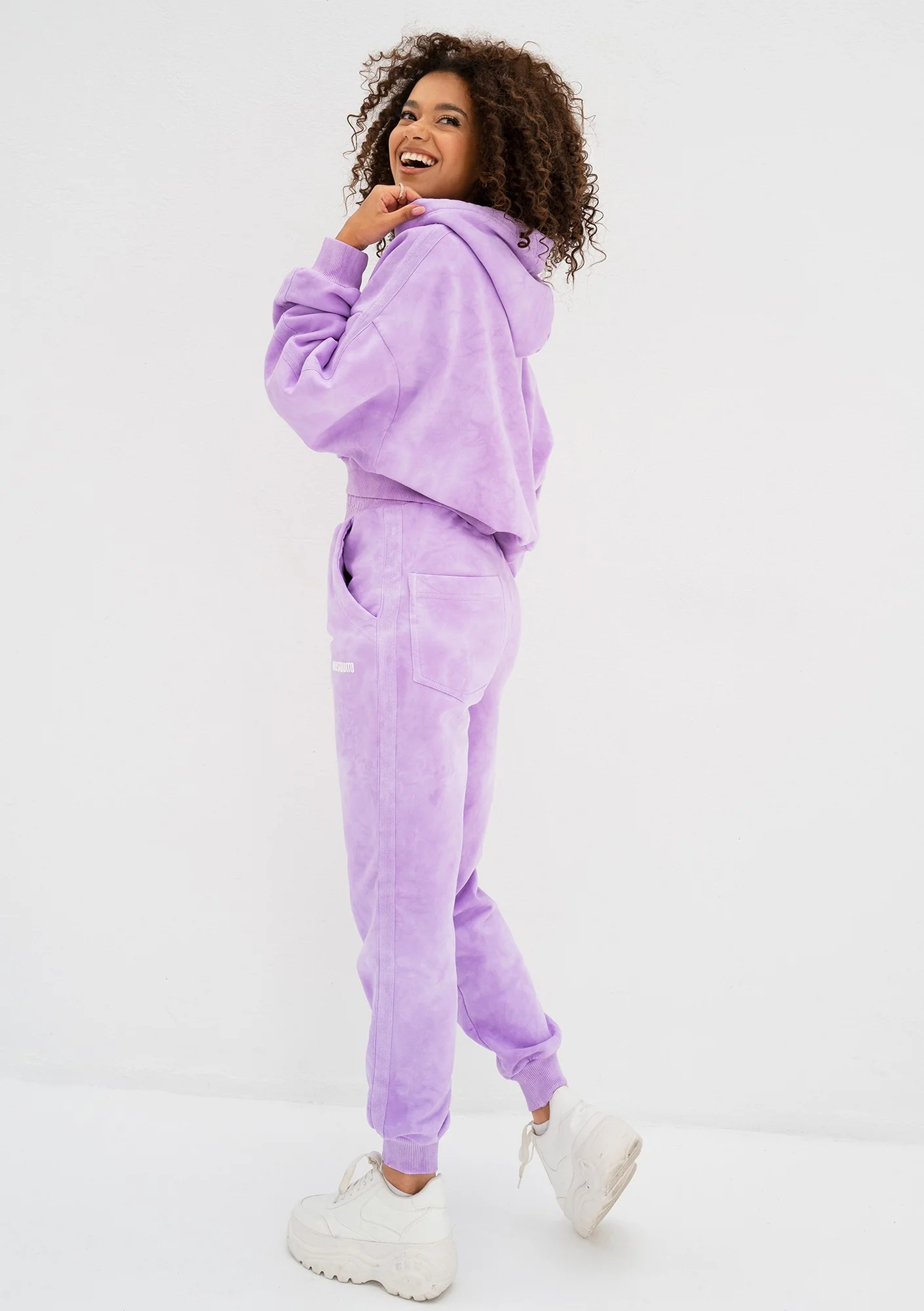 Liliowe spodnie dresowe to element modnego kompletu dresowego tie dye. Muszą znaleźć się na wierzchu Twojej szafy, na wypadek chłodniejszych i pochmurnych dni! Pozytywna kolorystyka fioletu lila oraz pełne stylowego luzu wykończenie tie dye wprowadzą Cię w optymistyczny nastrój.