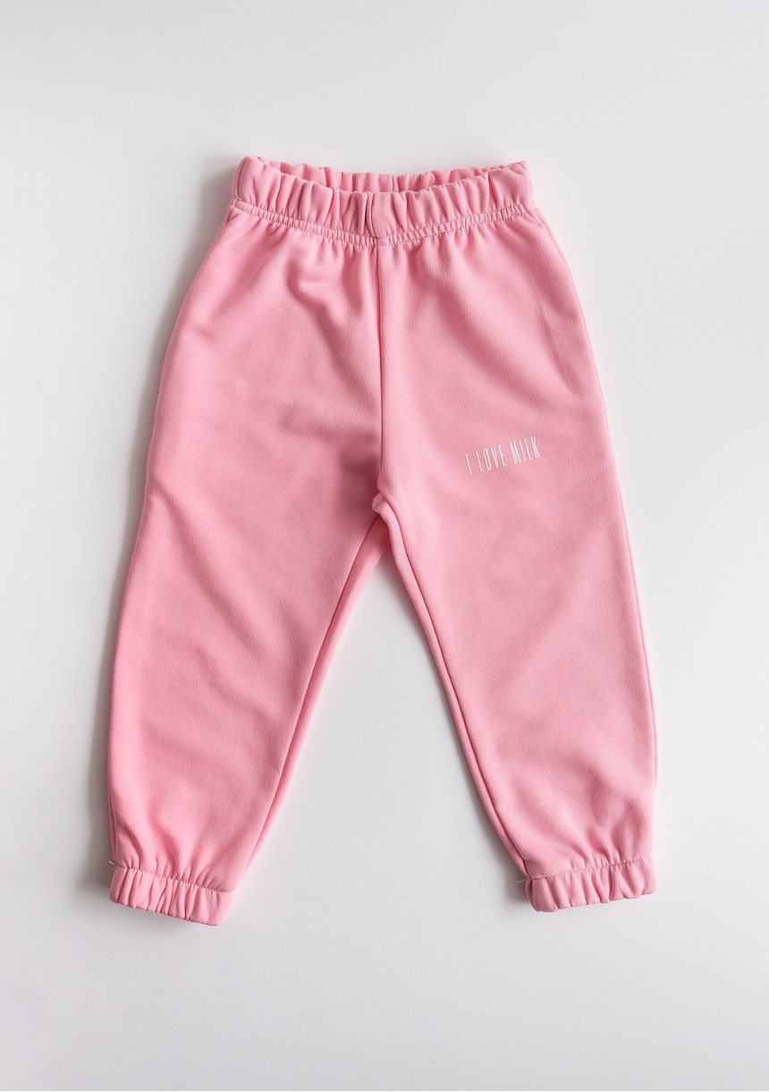 Różowe spodnie dziecięce dla małych miłośników neonów. Spodnie wykonaliśmy z przewiewnej, bawełnianej dzianiny.