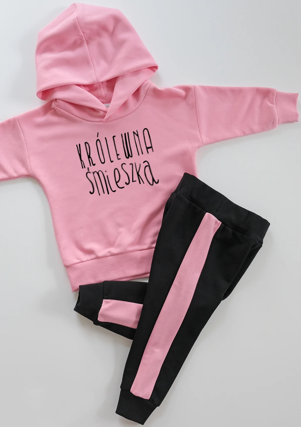 Dres dziecięcy to również praktyczne rozwiązanie dla rodziców, umożliwiające szybkie ubieranie dziecka, co jest ważne zwłaszcza w porannym pośpiechu. Spodnie przez nas wykonane posiadają praktyczny i dotychczas bestsellerowy fason z wygodnie luźnymi nogawkami. Model będzie udanym prezentem dla każdego malucha, który potrzebuje czuć się swobodnie podczas codziennych aktywności. Spodnie dresowe Pure wykonaliśmy z lekkiej, bawełnianej dzianiny. Różowe pasy boczne przypadną do gustu szczególnie dziewczynkom, dla których zaprojektowaliśmy serię różowych bluz z kapturem, ozdobionych zabawnymi napisami. Są również dostępne w aktualnej i stałej ofercie. Z prezentowanymi spodniami stworzą cudowne komplety dresowe dla dzieci.