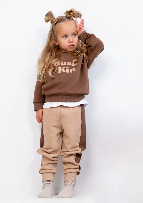 Beżowe spodnie dziecięce z brązowymi lampasami to wszechstronny model, którym uzupełnisz codzienny ubiór malucha. Świetnie pasują do naszych bluz z różnymi nadrukami.