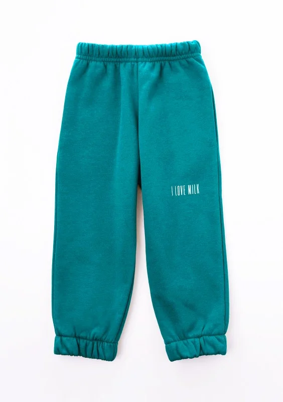 Wygodne spodnie dziecięce w żywiołowym turkusie, uszyte z miękkiej dzianiny bawełnianej z meszkiem od spodu.