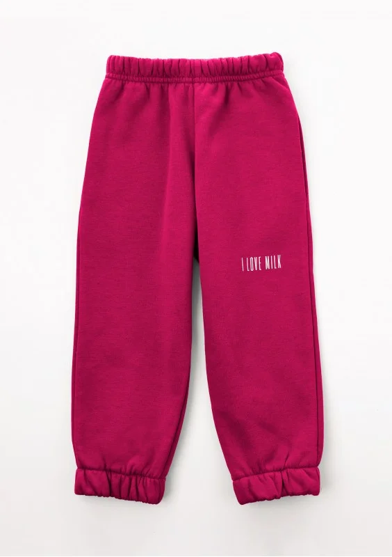 Uniwersalne spodnie dziecięce o wygodnym, sportowym kroju. Uszyte w polskiej szwalni z miękkiej dzianiny bawełnianej w modnym odcieniu magenta.