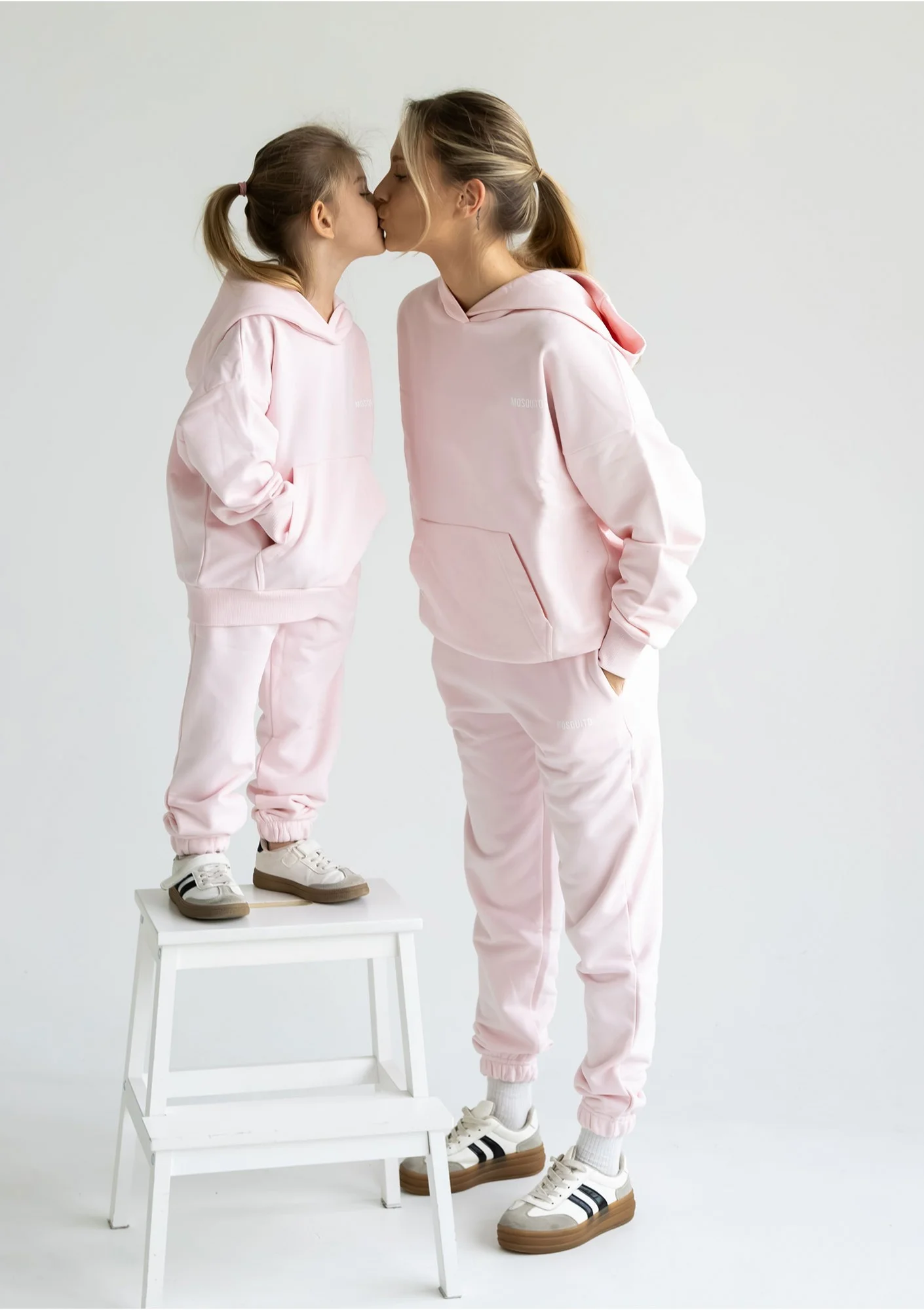 Dostępne w naszej ofercie dziecięce spodnie wykonane są z miękkiej dzianiny i zachowane w delikatnym odcieniu różowego, czyli candy pink. W pasie posiadają elastyczną gumkę, która pozwala lepiej jej dopasować i zapobiegać zsuwaniu się spodni, co w przypadku dzieci jest bardzo komfortowe. Na lewej nogawce znajduje się białe logo marki. Ten model, zarówno z przodu, jak i z tylu jest całkowicie gładki. Dodatkowo dostępny jest w kilku rozmiarach, co sprawia, że na pewno łatwiej będzie go dopasować. Te spodnie dziecięce można nosić solo, albo połączyć do kompletu z bluzą w tym samym odcieniu, co na pewno stworzy idealną, bardzo modną całość. Ten dziecięcy różowy dres ma swoją wersję damską, dla mam.