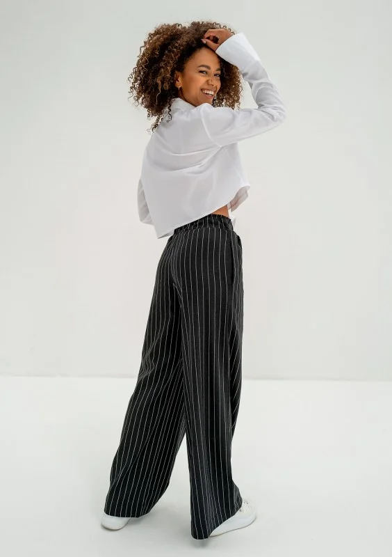 Stylowe spodnie damskie palazzo w prążki z najmodniejszą, szeroką nogawką. Uszyte w całości z naturalnego lnu.