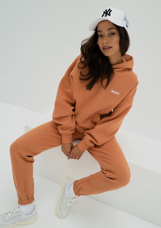 Wygodne spodnie damskie dresowe o luźnym kroju. Model z kieszeniami i logiem, wykonany w idealnym na chłodniejszą porę, pomarańczowym odcieniu.