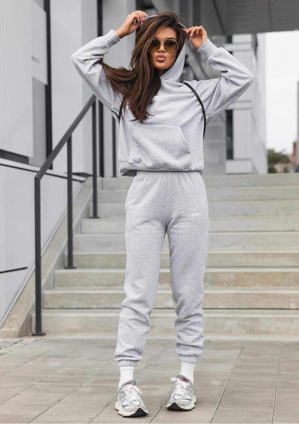 Dresowe spodnie damskie o stylowo luźnym kroju, uszyte z przyjemniej miękkiej dzianiny bawełnianej. Model w klasycznym kolorze melanżowej szarości.