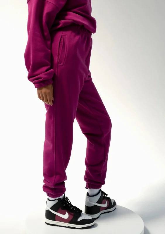 Spodnie damskie w jagodowym kolorze dla miłośniczek dresów w wyrazistych i pozytywnie nastrajających kolorach. Z tym modelem możesz stworzyć stylowy komplet wraz z dedykowaną bluzą z kapturem Icon. Taki zestaw będzie pasował na wiele prostych i codziennych okazji. Nasze dresy damskie zapewnią Ci wygodę i świetny wygląd podczas spacerów, lekkiej rekreacji w parku lub luźnych spotkań ze znajomymi.