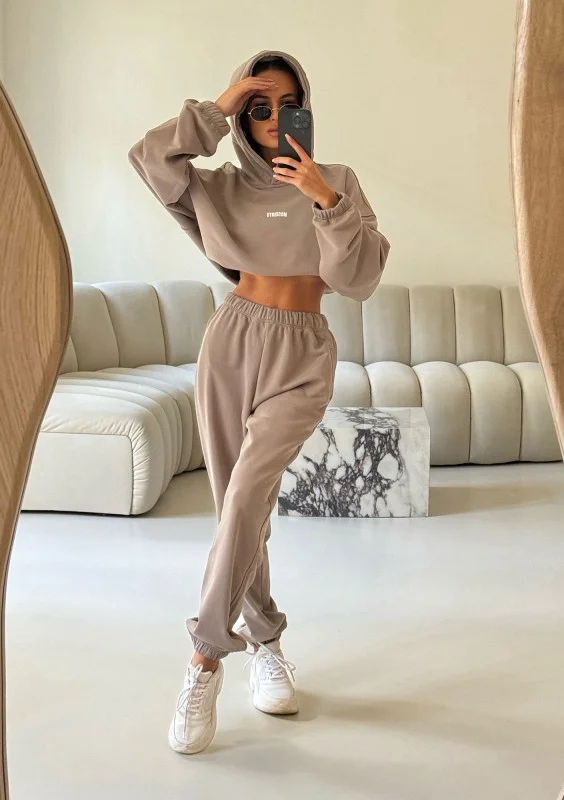 Odkryj stylowy dres damski polskiej marki. Luźne spodnie z kieszeniami i logiem z tyłu zostały uszyte z dzianiny pętelkowej w pięknym kolorze taupe.