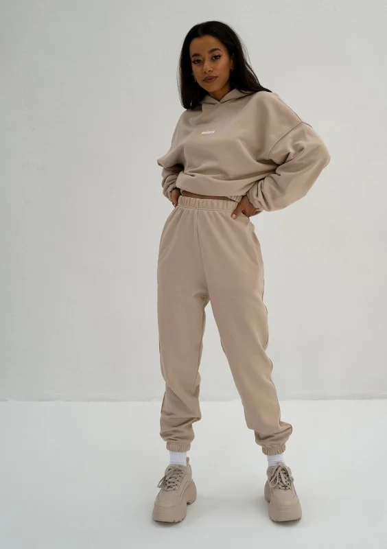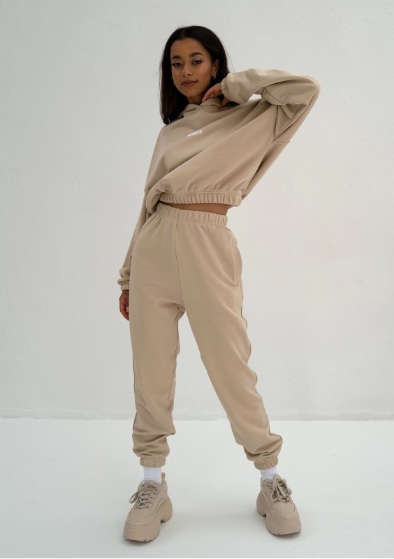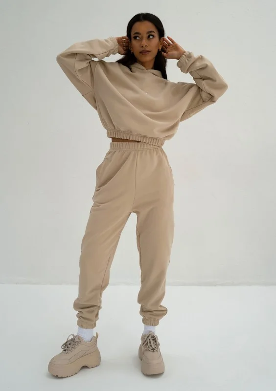 Wygodne spodnie damskie dresowe w uniwersalnym kolorze piaskowego beżu. Wyposażone w kieszenie.