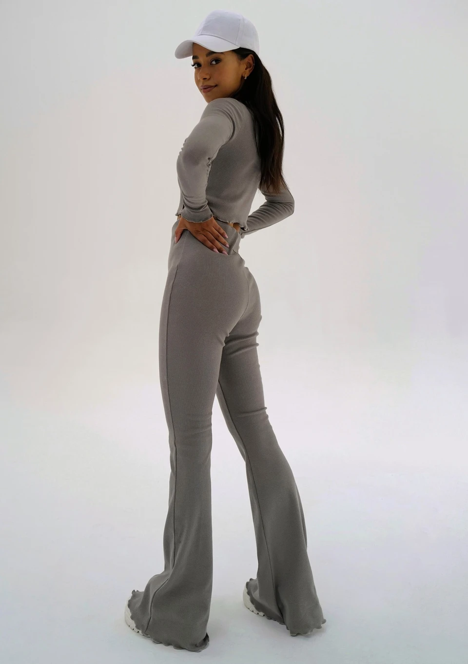 Bawełniane spodnie damskie z prążkowanej dzianiny w kolorze taupe. Modnie dopasowane, zmysłowo podkreślą linie sylwetki.