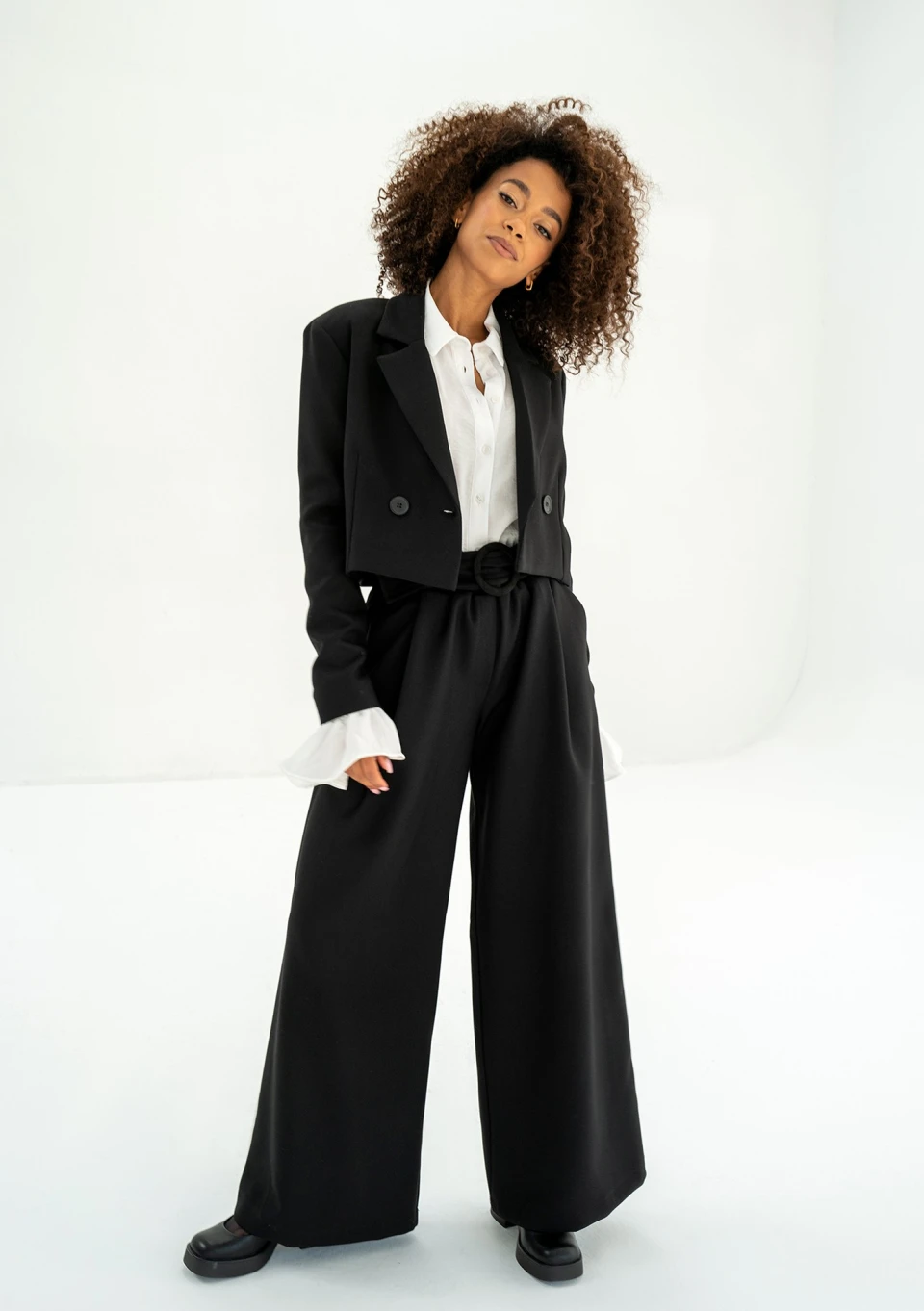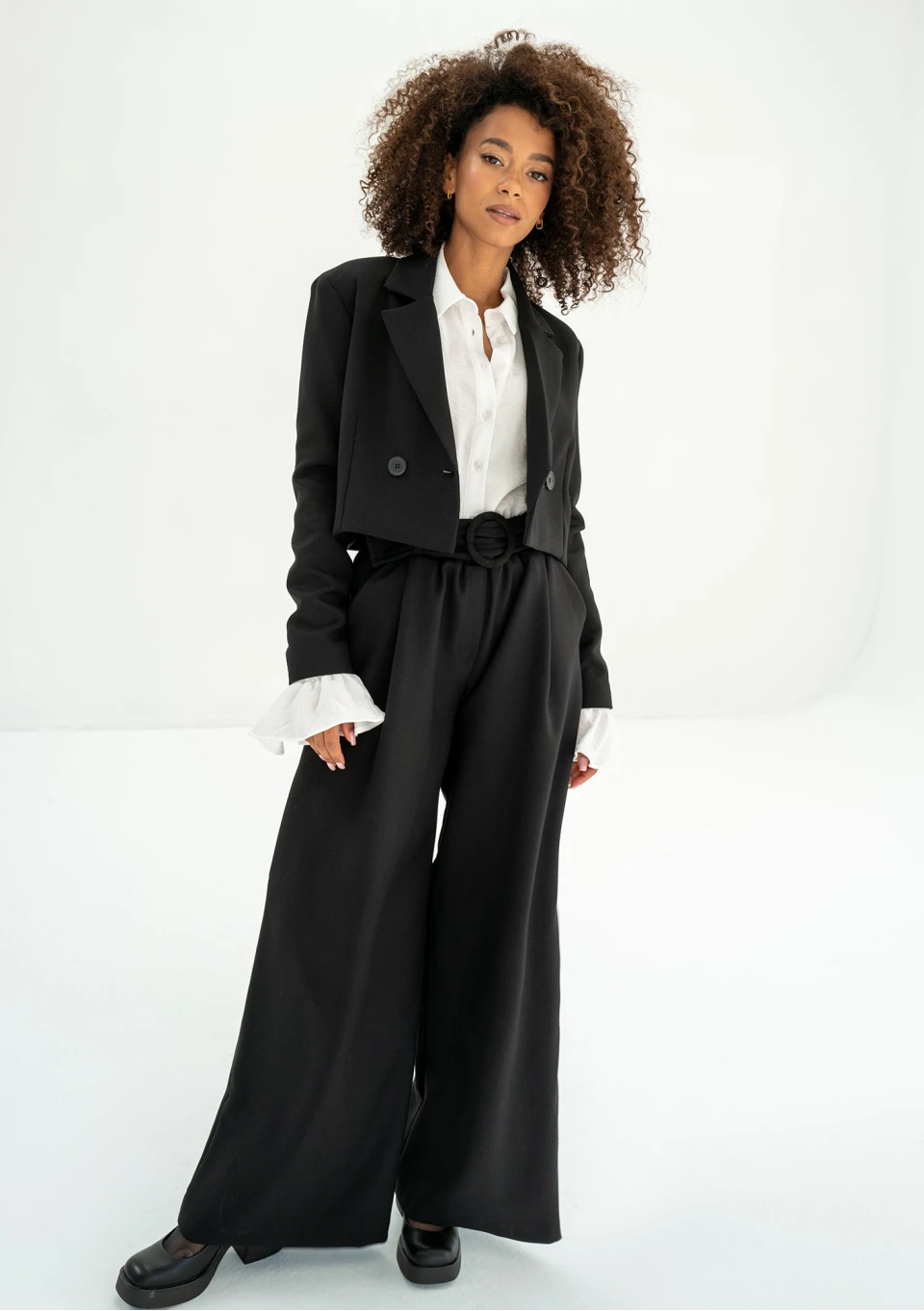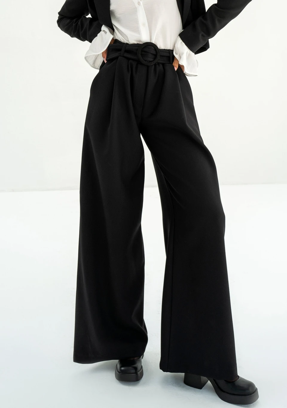 Szerokie spodnie damskie w czarnym kolorze, wykonane z tkaniny z wiskozą. W zestawie elegancki pasek. Model dedykowany marynarce Shani.