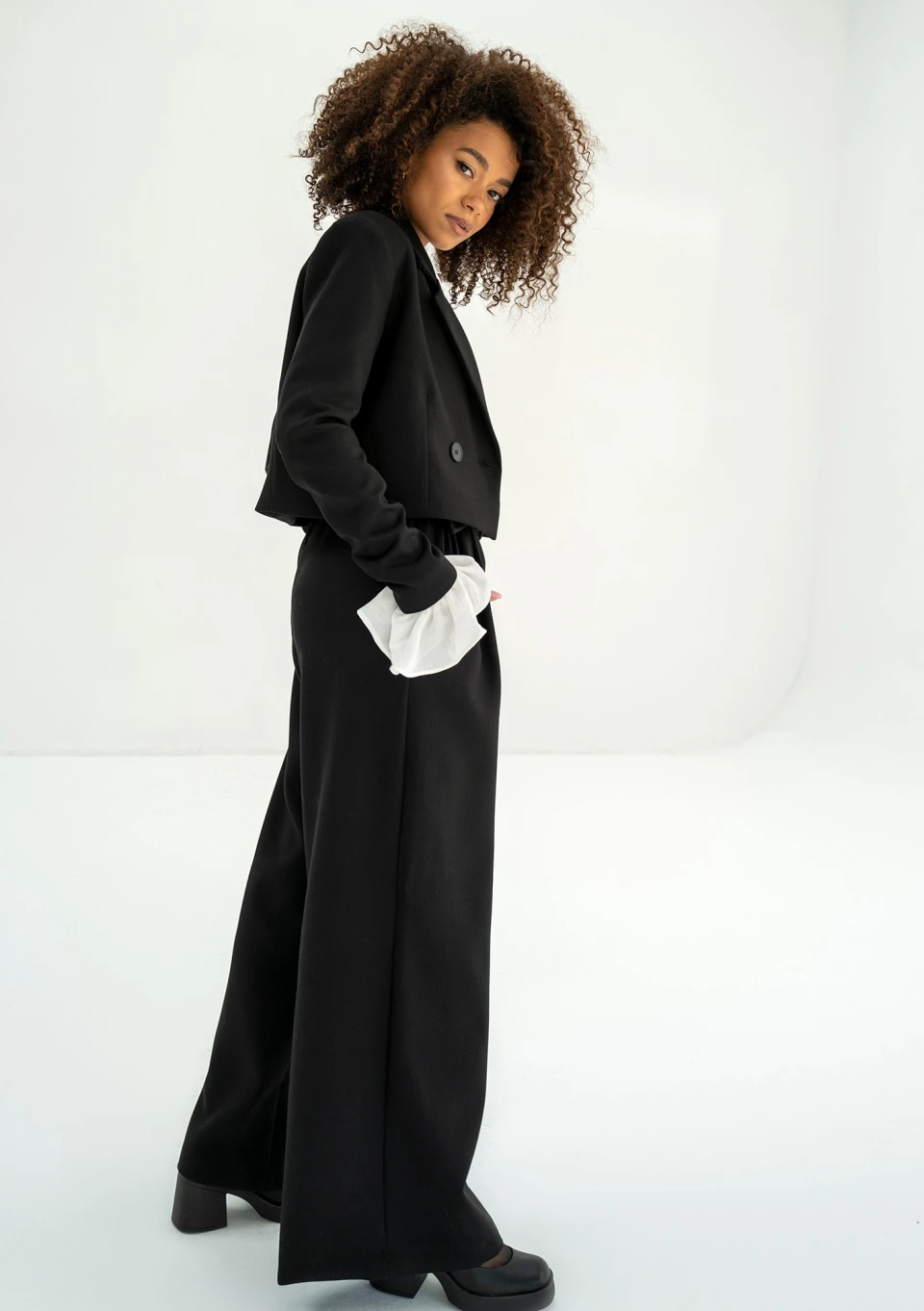 Im szerzej, tym aktualnie lepiej. Spodnie z luźną nogawką w stylu dzwonów są aktualnie najmodniejszym fasonem. Model Shani został zaprojektowany na oficjalne spotkania i okazje, które wymagają eleganckiego wizerunku. Stworzą modny i szykowny komplet z krótką, dedykowaną marynarką. To idealna stylizacja do pracy.
