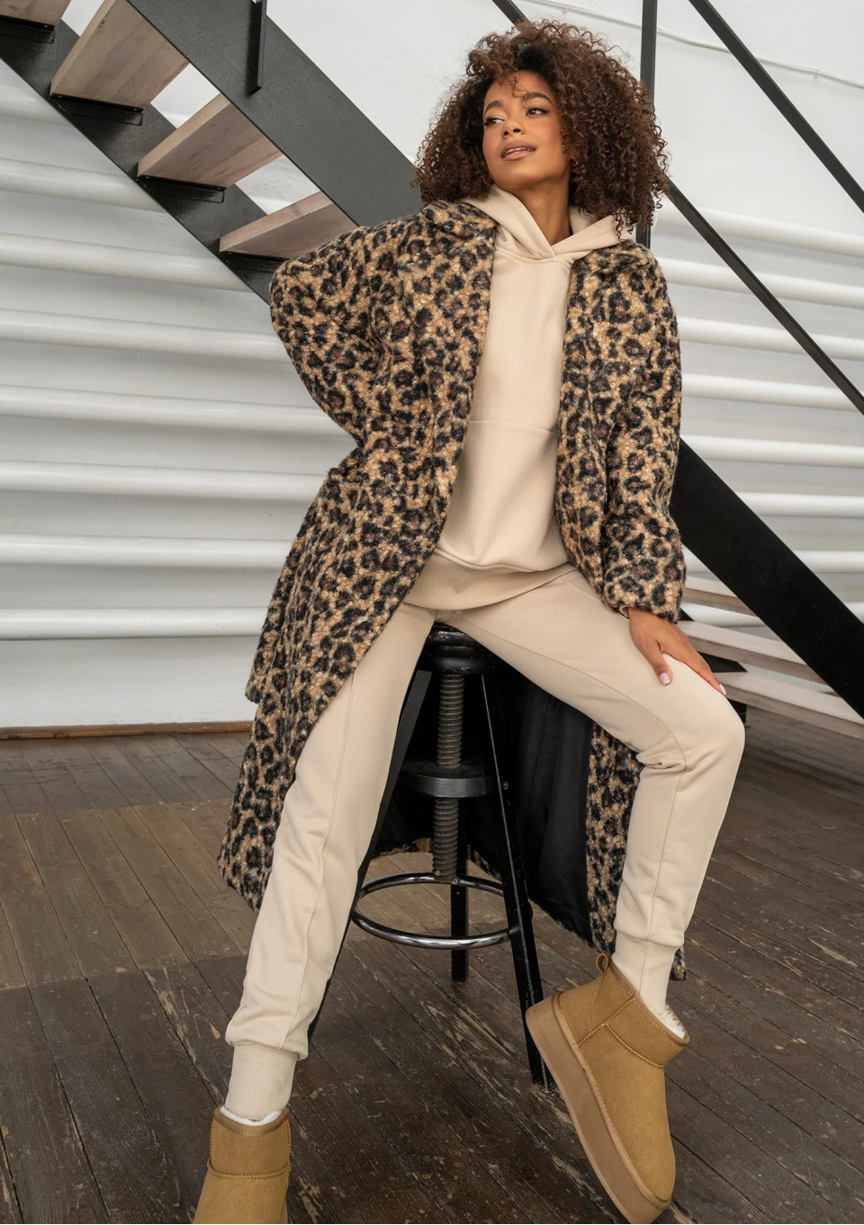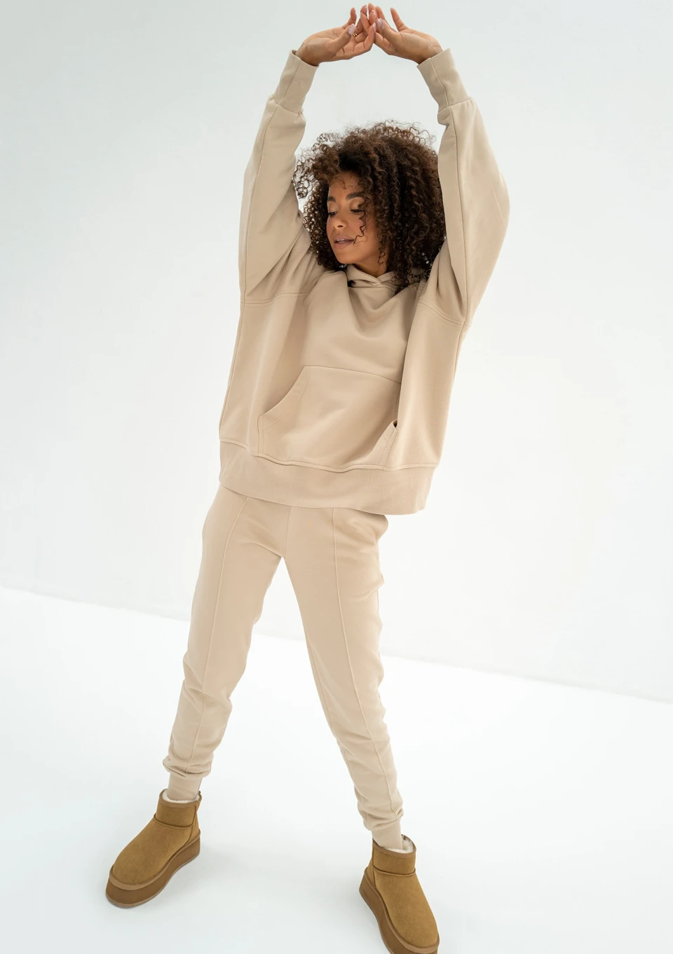 Beżowe spodnie dresowe damskie o kroju Hoody to odrobinę dopasowany model typu jogger. Świetnie uzupełniają bluzę od kompletu, która jest obszernym fasonem oversize.