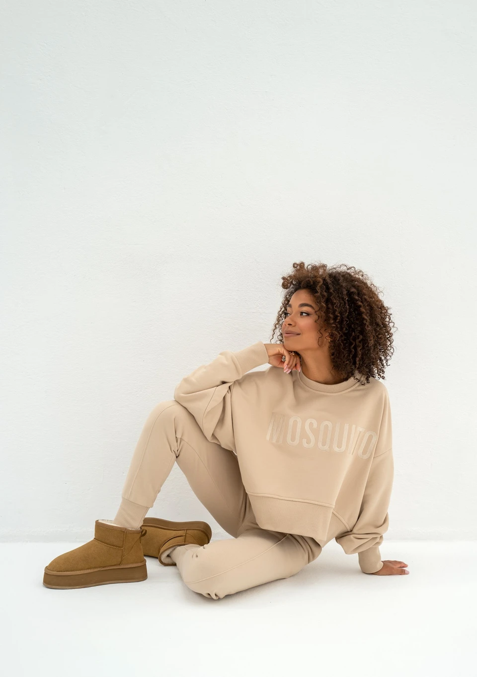 Beżowe spodnie dresowe damskie wykonaliśmy z gęstej dzianiny o pętelkowej fakturze spodu. Taki materiał nie posiada meszku. W składzie dominują naturalne włókna bawełny. Prezentujemy element dresu, który w całości pochodzi z polskiej szwalni. Wszystkie modne dresy damskie Mosquito są szyte lokalnie, w Tomaszowie Mazowieckim.