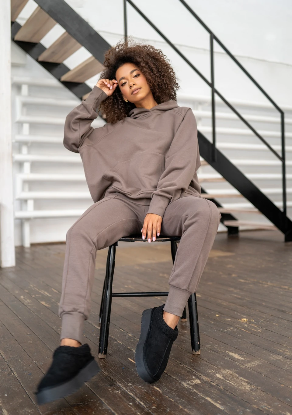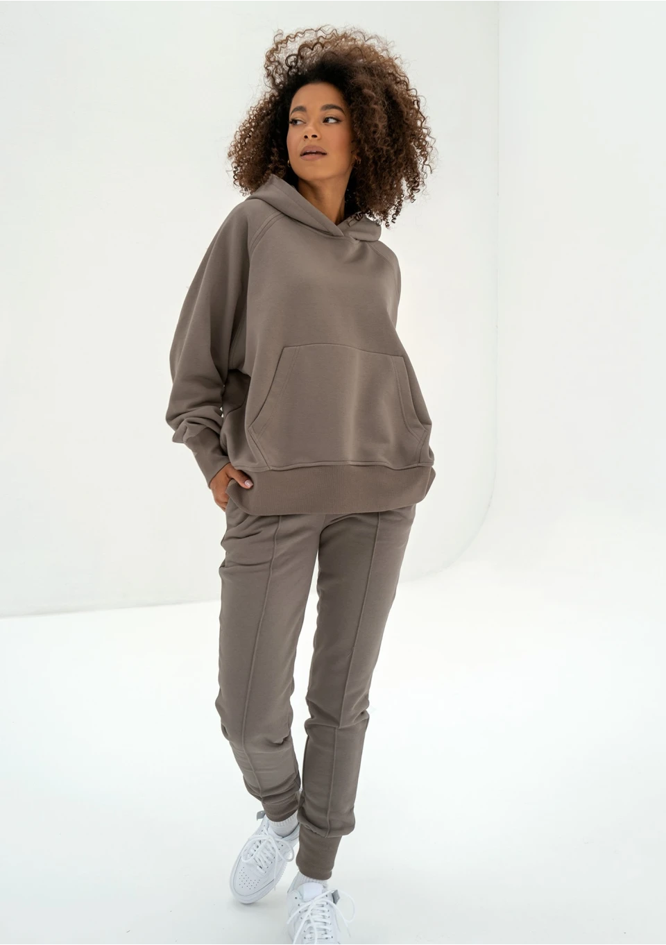 Dresowe spodnie damskie o dopasowanym kroju typu jogger. Wyposażone w praktyczne kieszenie i wygodne ściągacze. Model w brązowym odcieniu.