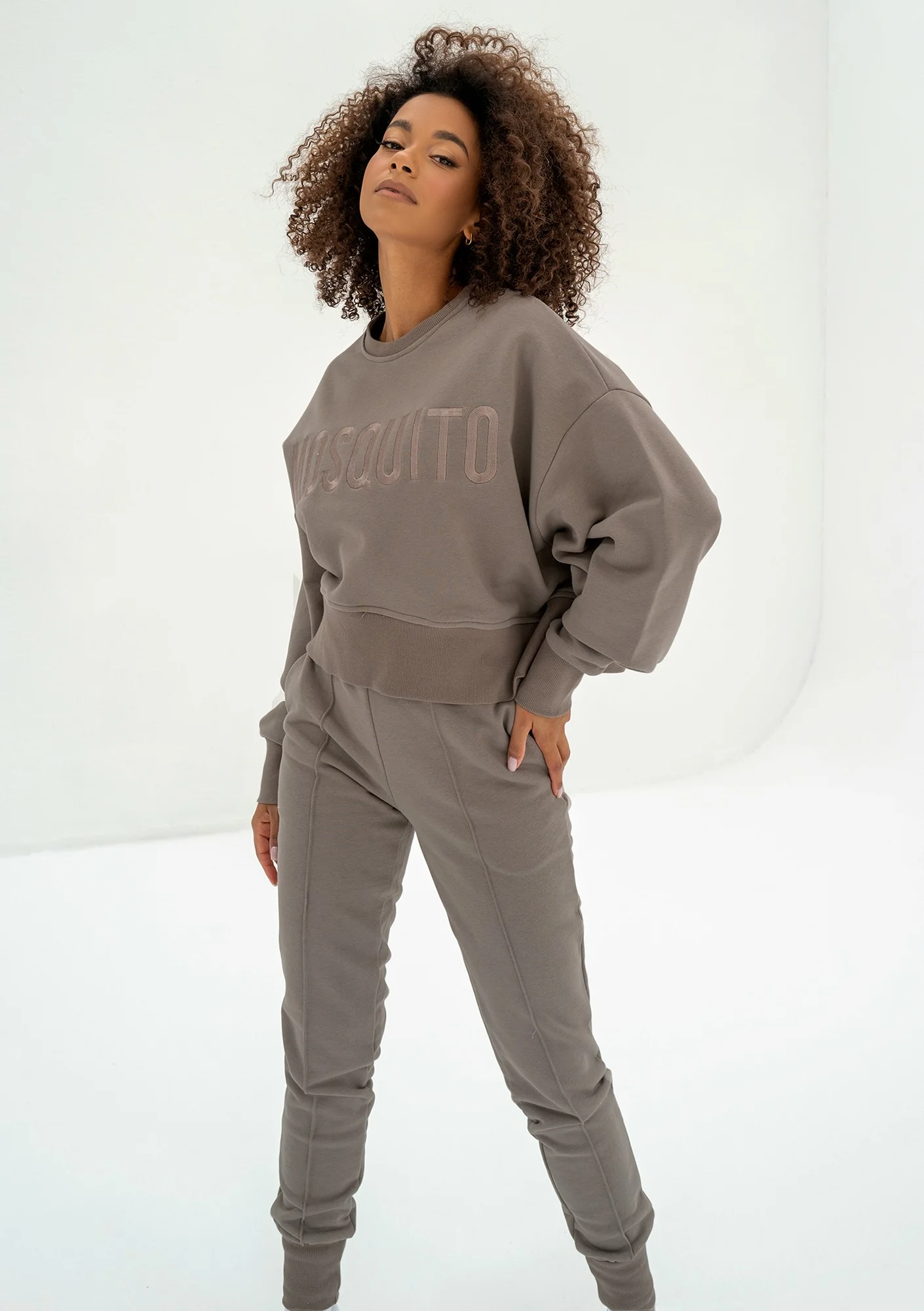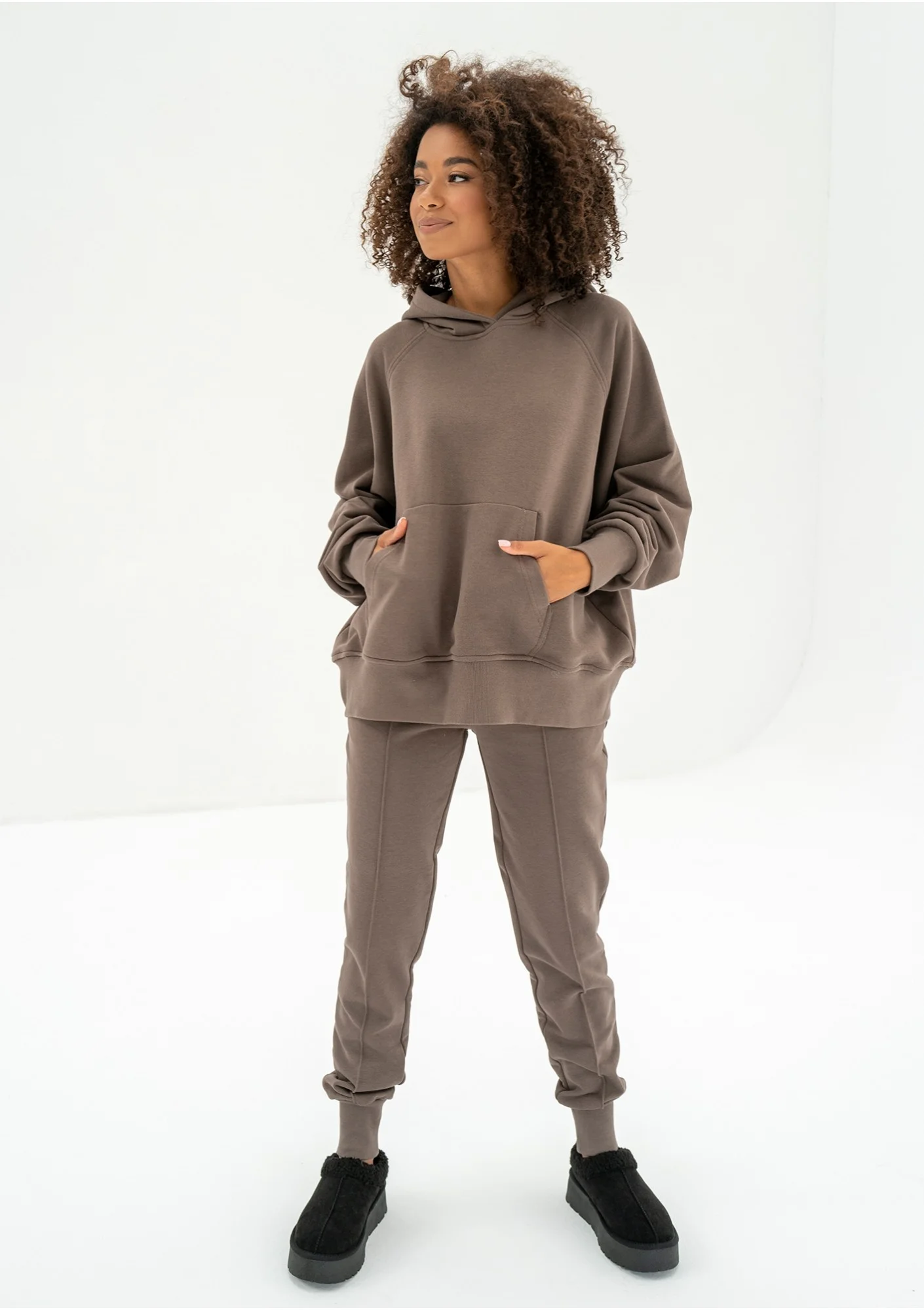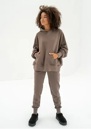 Fason luźny, z gumką w pasie i kieszeniami, na dole dopasowane ściągacze.