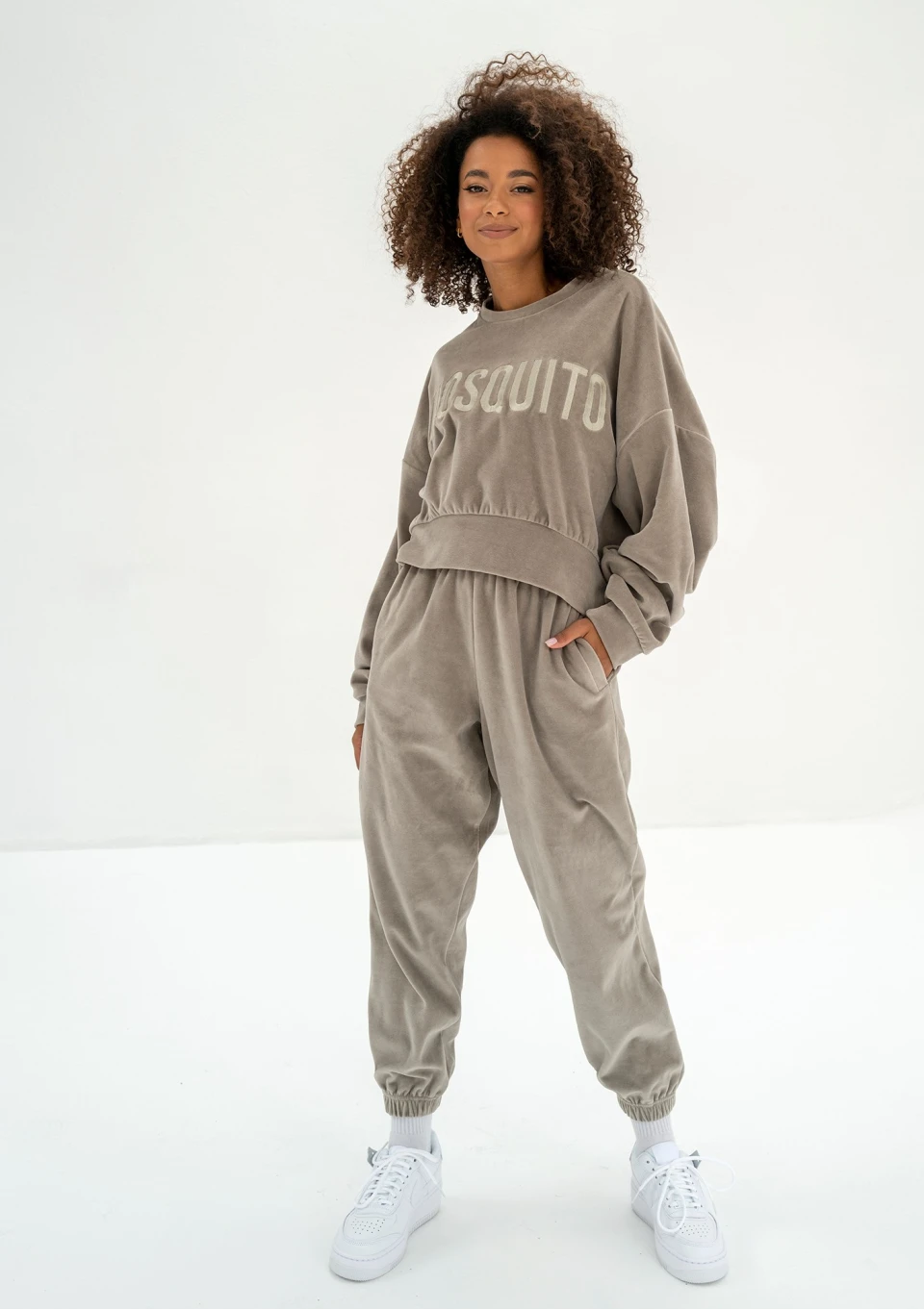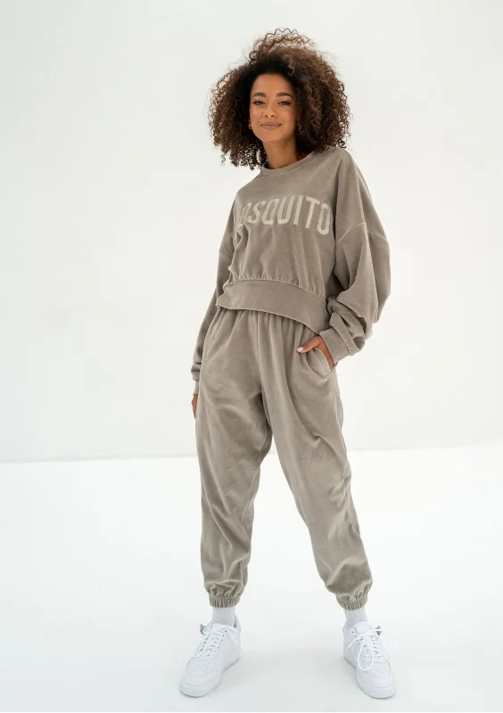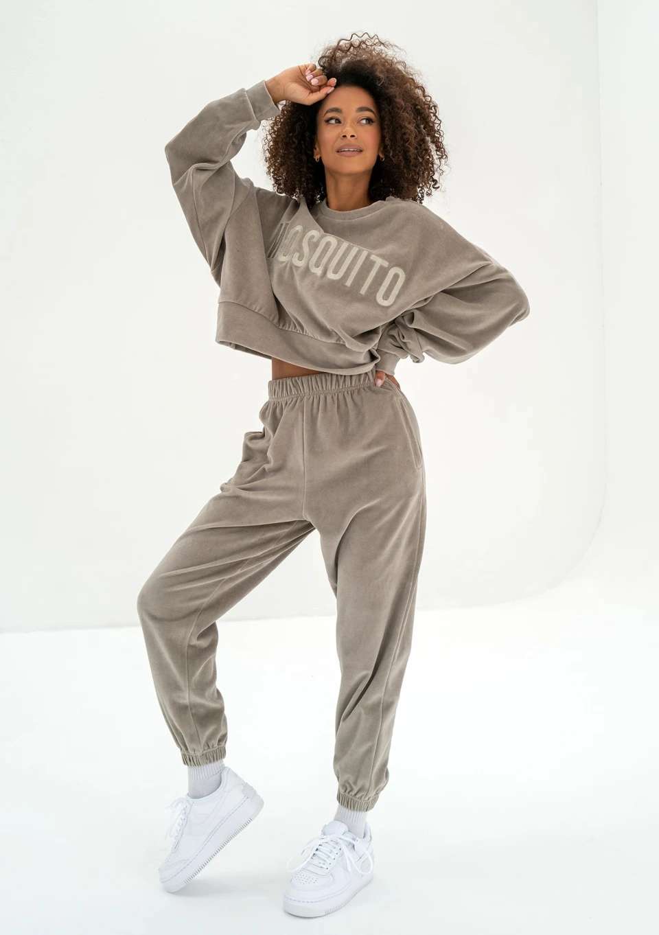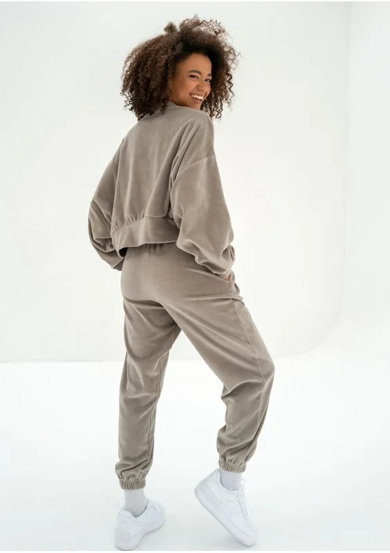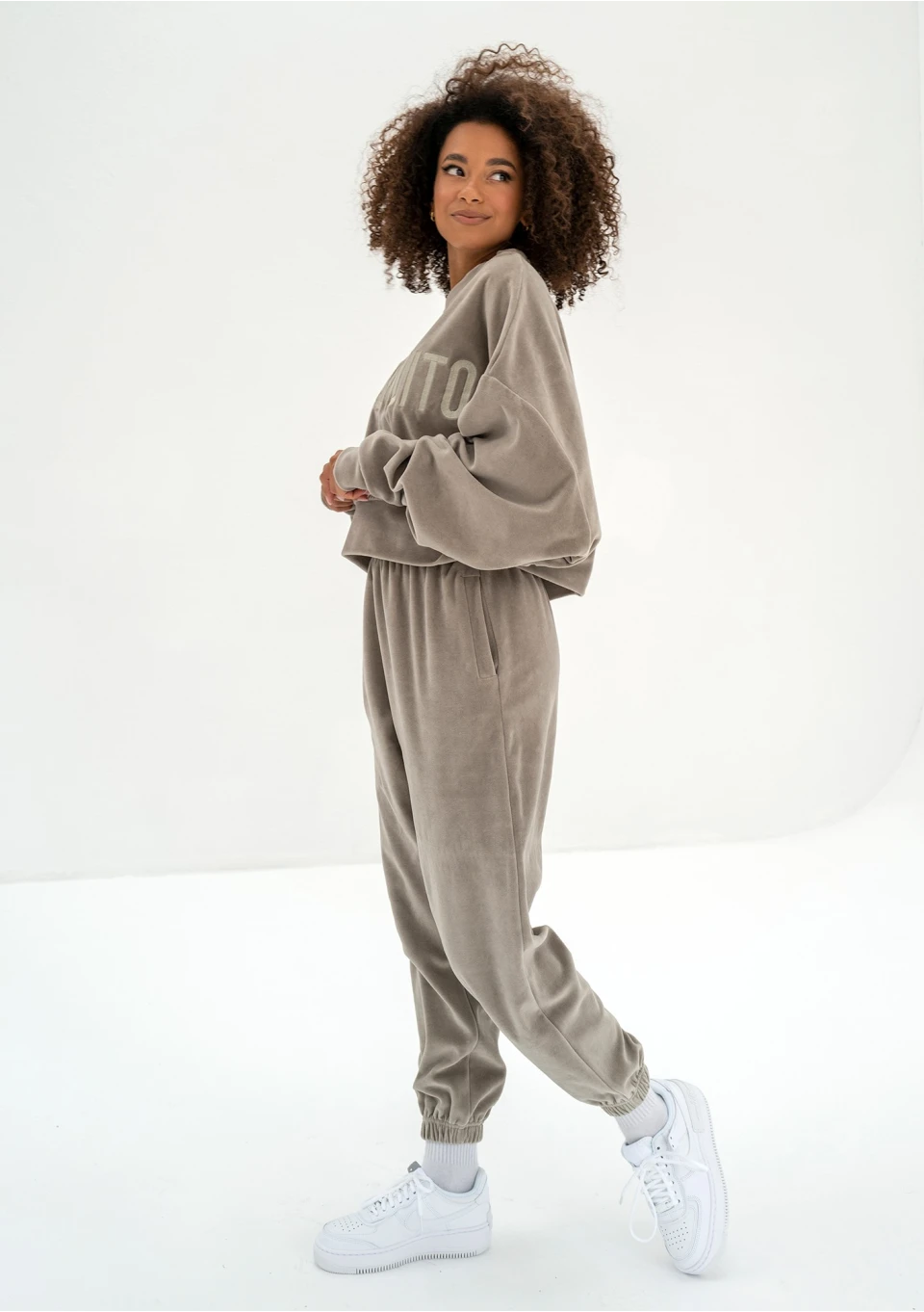 Spodnie dresowe damskie z weluru, w eleganckim kolorze taupe. Posiadają luźny krój i stylowo układają się na sylwetce.