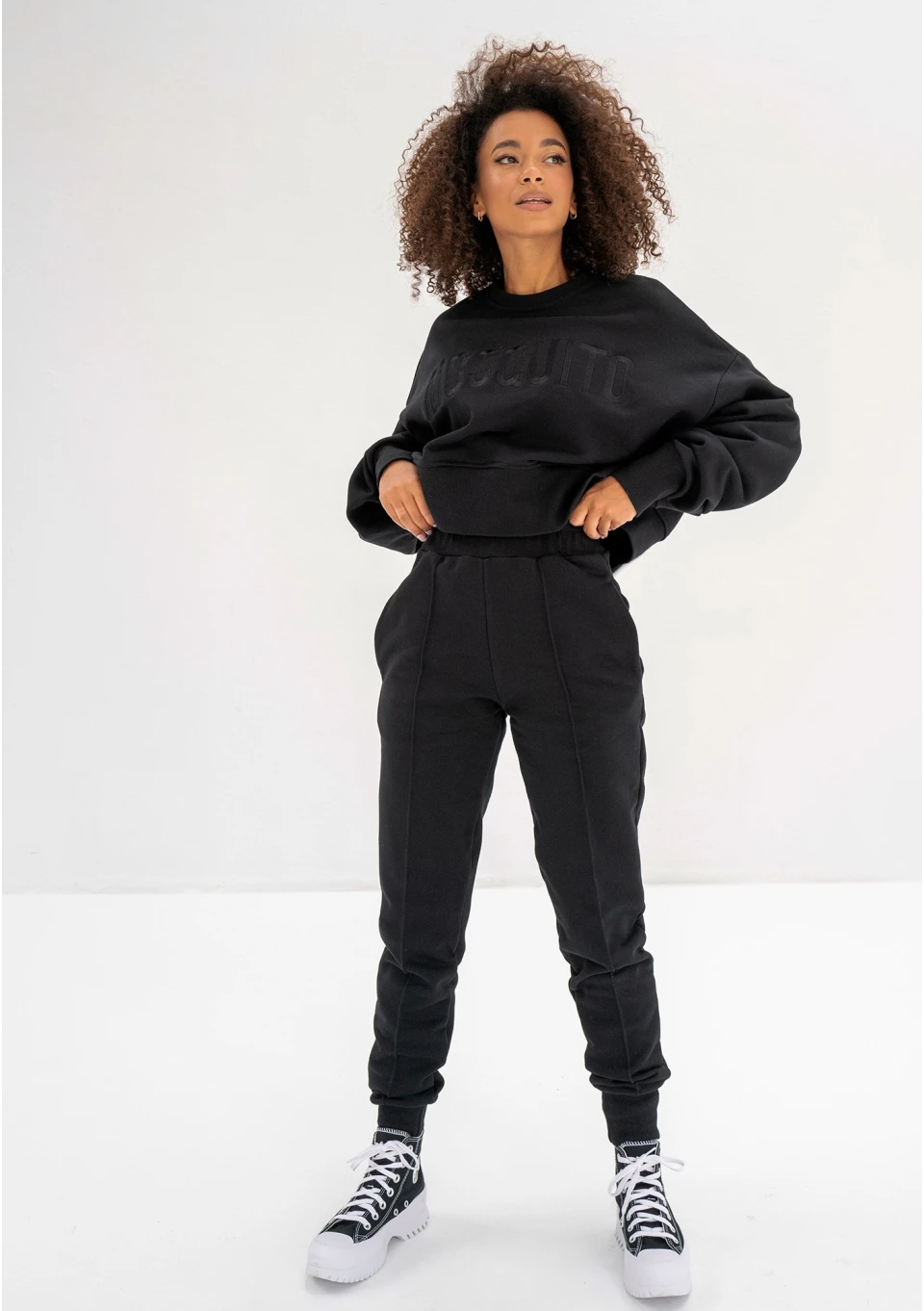 Czarne joggery dresowe damskie są w drobnym stopniu dopasowane do sylwetki, przylegają dzięki wygodnym ściągaczom. Uzupełnione praktycznymi kieszeniami.