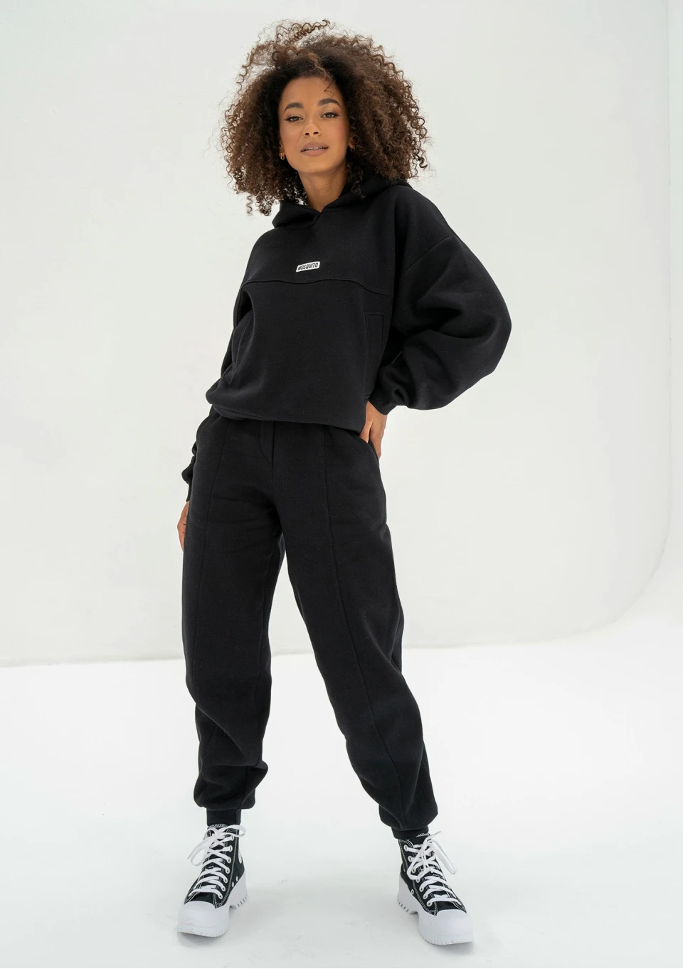 Fason bardzo luźny, z gumką w pasie, imitacją rozporka i kieszeniami, na dole dopasowane ściągacze.