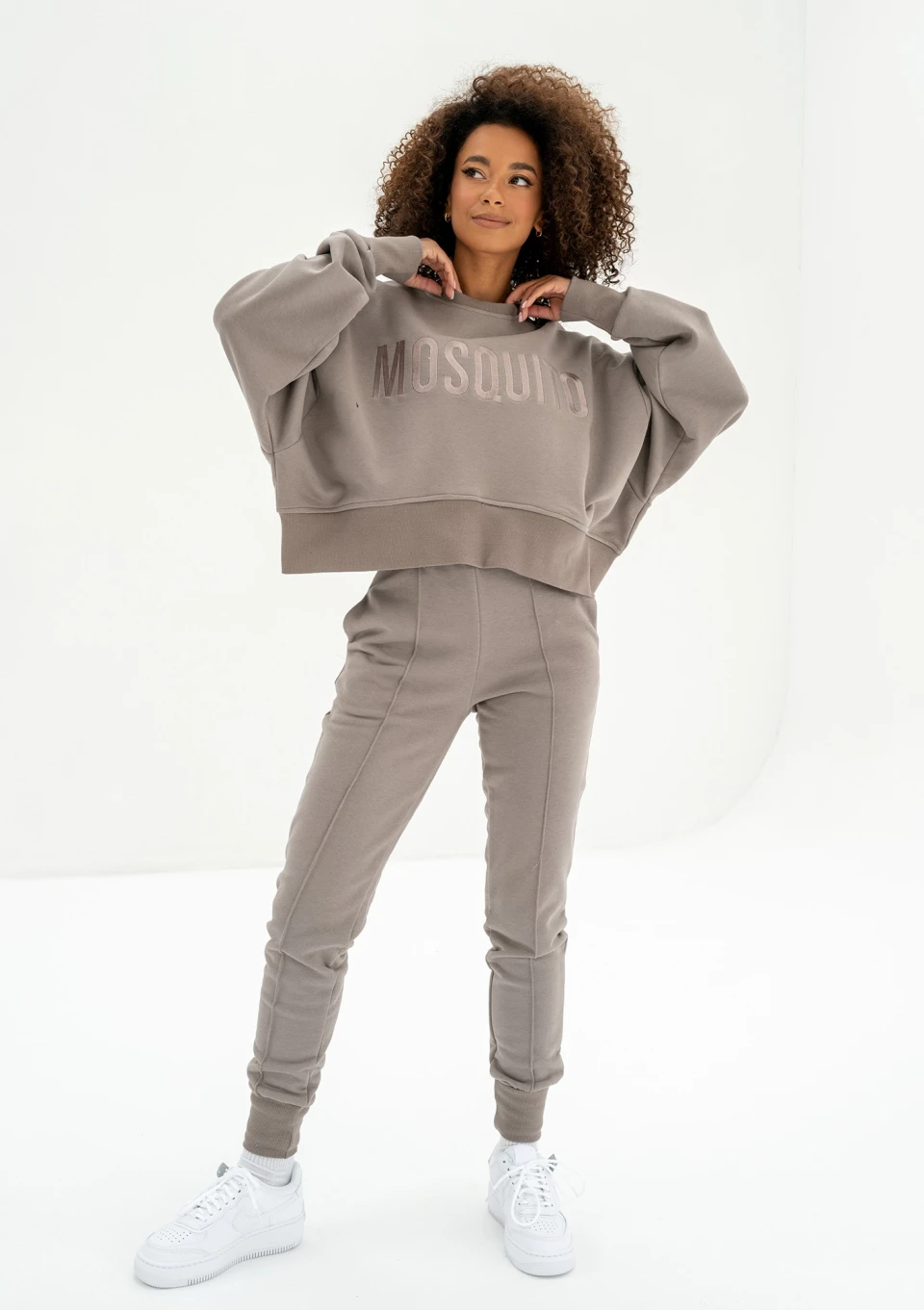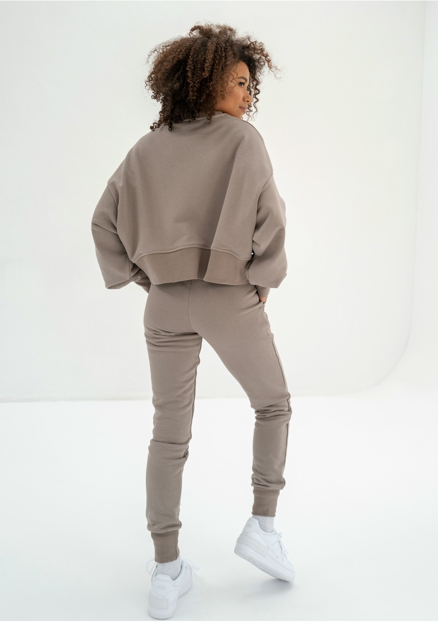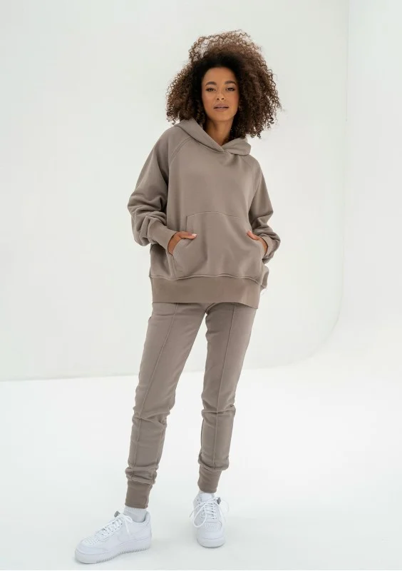 Stylowe joggery dresowe damskie w delikatnym kolorze taupe. Spodnie są w drobnym stopniu dopasowane do sylwetki, przylegają dzięki wygodnym ściągaczom.