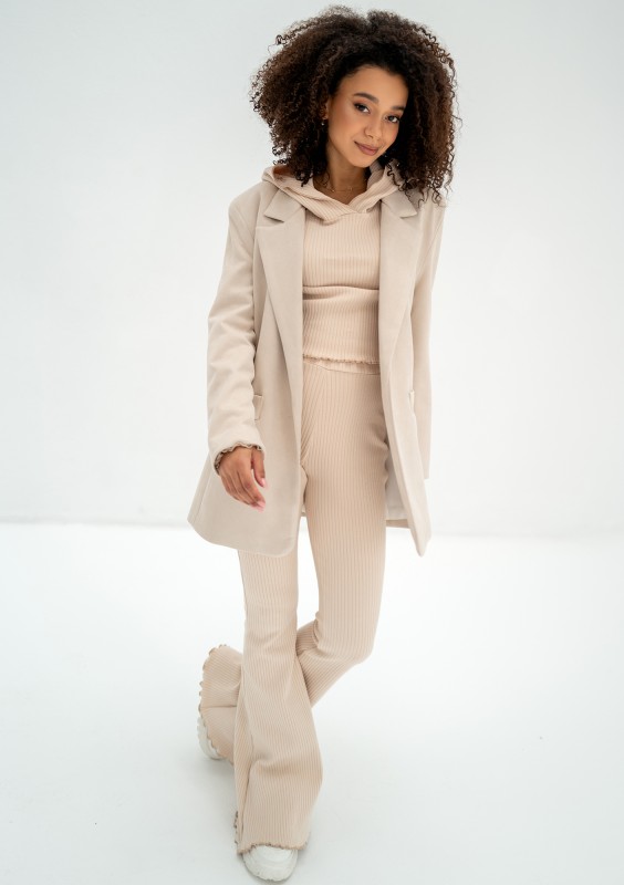 Beżowe spodnie damskie bawełniane z prążkowanej dzianiny. Modnie dopasowane, zmysłowo podkreślą Twoją figurę.