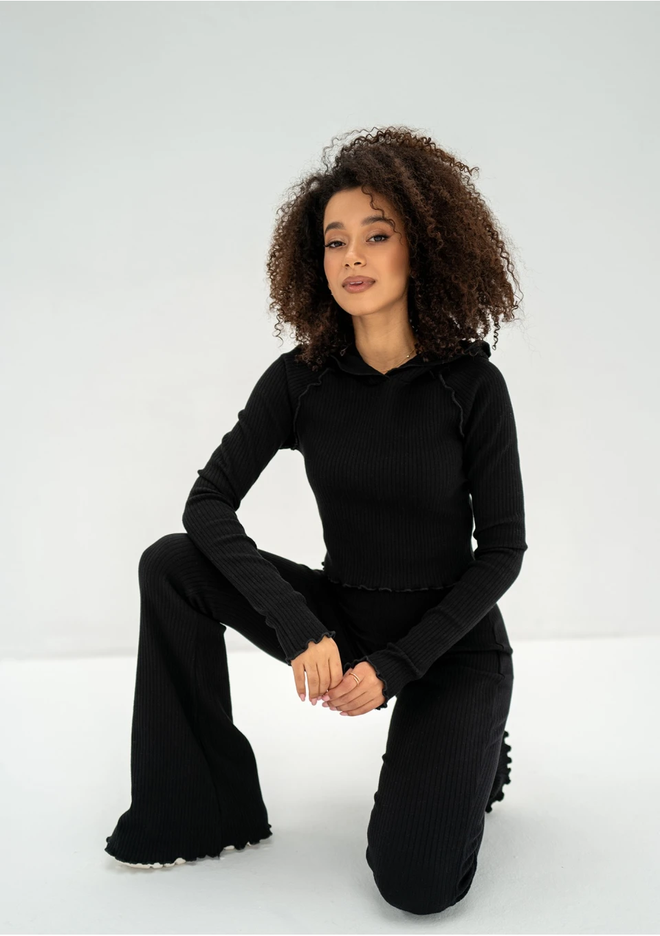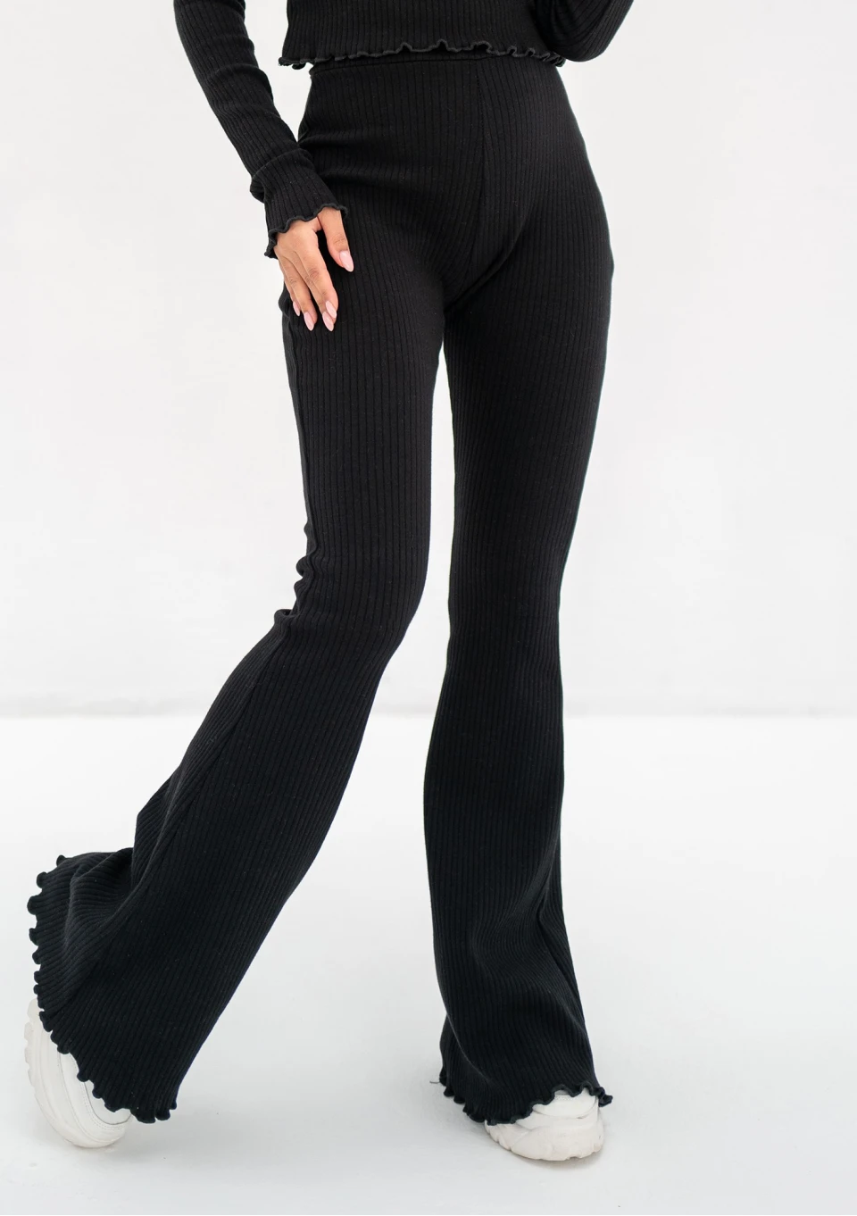 Czarne spodnie damskie bawełniane z prążkowanej dzianiny. Zmysłowo dopasowane, podkreślą Twoją figurę.