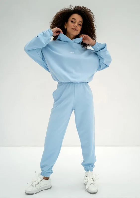 Lekkie damskie spodnie dresowe w pastelowym, błękitnym odcieniu, wykonane z dzianiny dresowej bawełnianej o pętelkowej strukturze włókien. Gładkość koloru zapewnia całkowitą neutralność, dlatego jest świetnym wyborem dla modowych minimalistek. Design zaskakuje umiejscowieniem logotypu, który znajduje się z tyłu. Luźny fason Icon posiada elastyczne gumki w nogawkach i został wyposażony w kieszenie.