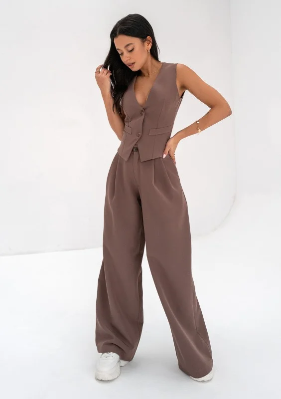 Brązowe spodnie damskie palazzo to wszechstronny element garderoby, który można łączyć na wiele sposobów, tworząc różnorodne zestawy. My proponujemy stylizację, która wszystkich zaskoczy! Dodaj designerską kamizelkę i noś ją odważnie bez dodatkowej koszuli czy bluzki. Do brązowych spodni z szeroką nogawką będą pasowały także klasyczne swetry, jasne koszule, a nawet zwykłe koszulki, dzięki którym całość nabierze casualowego stylu.