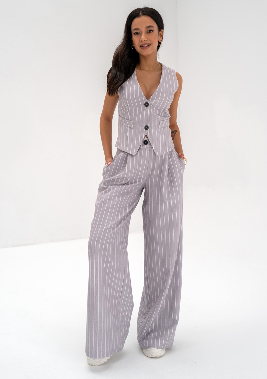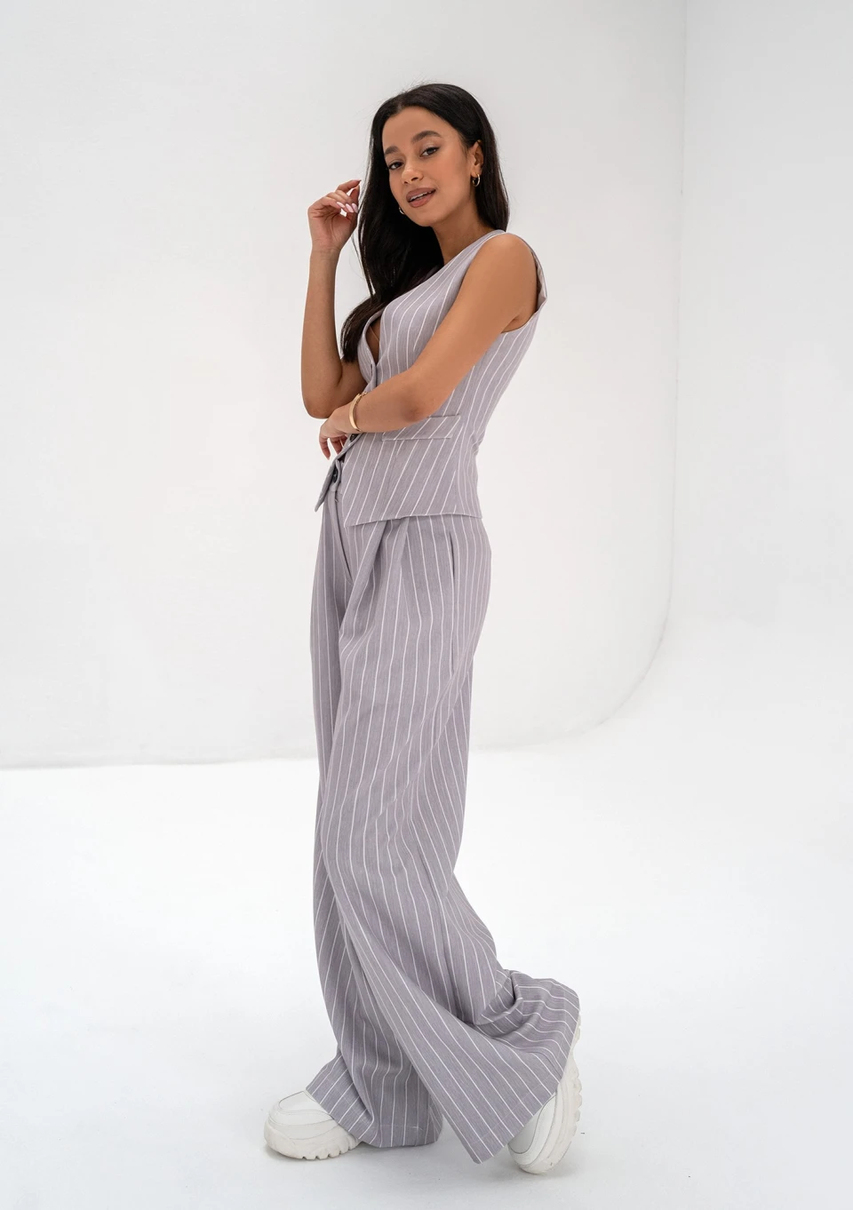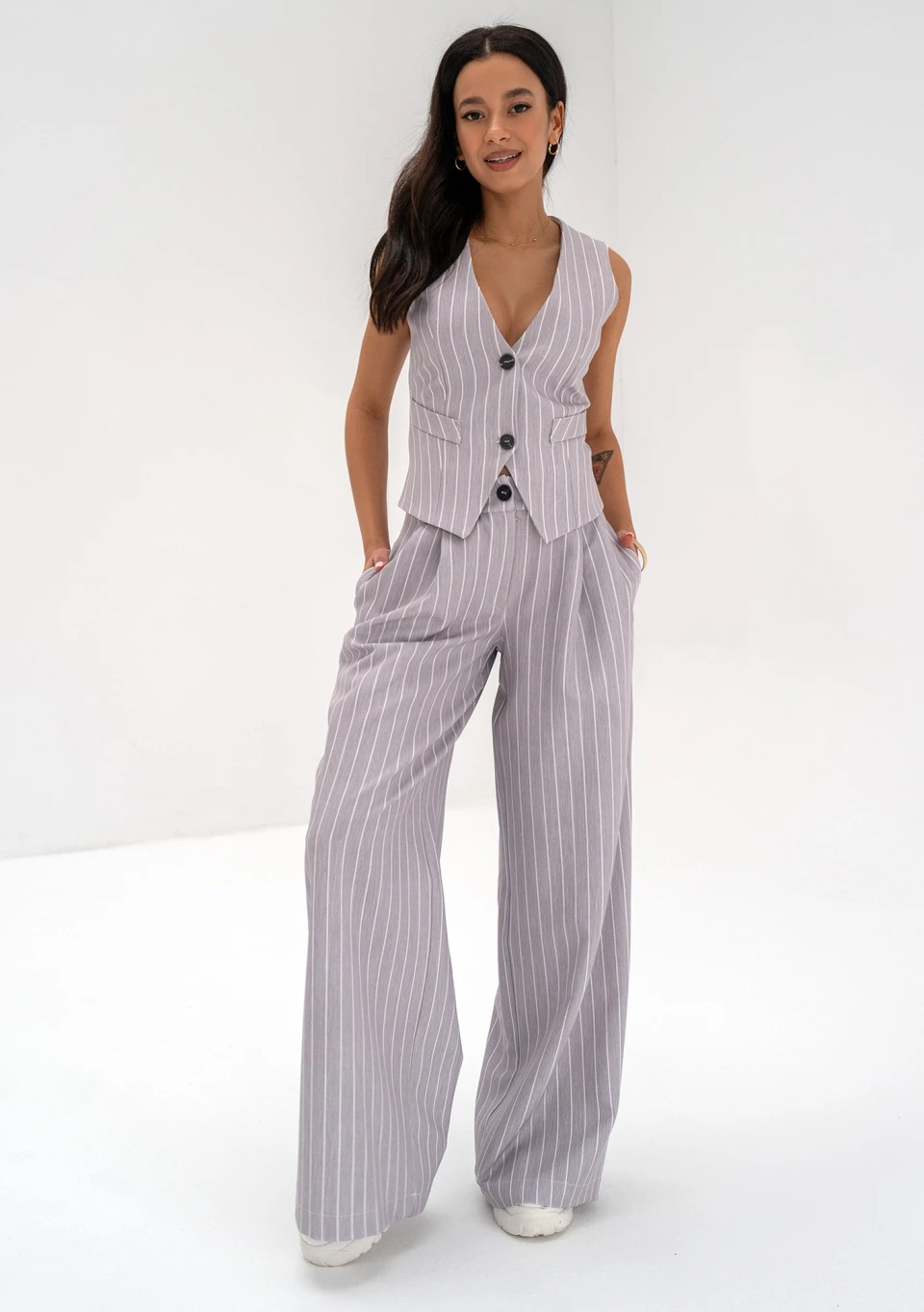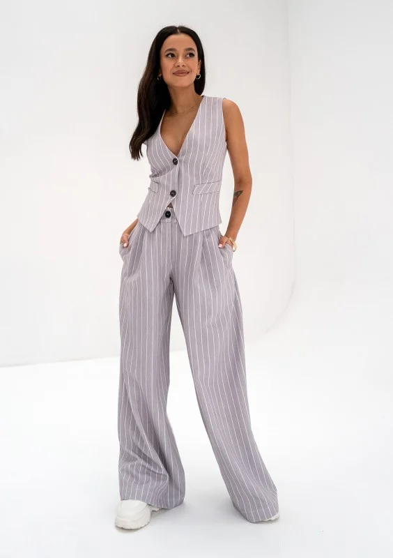 Stylowe, szare spodnie damskie palazzo w prążki, prezentujące się w najnowszym trendzie z obszernymi nogawkami.