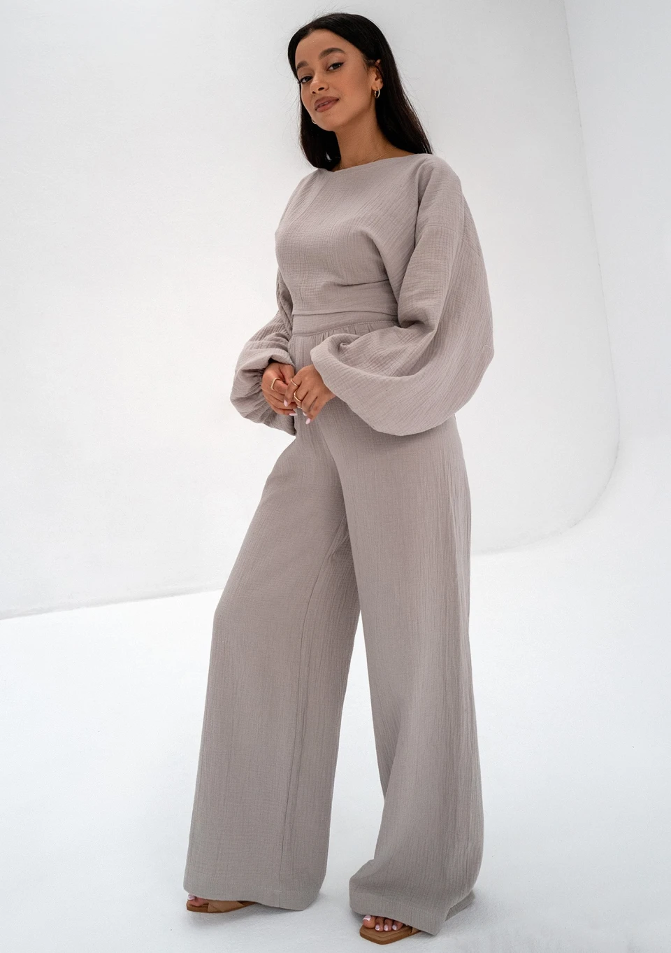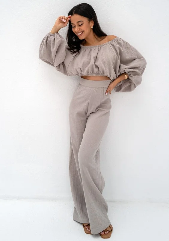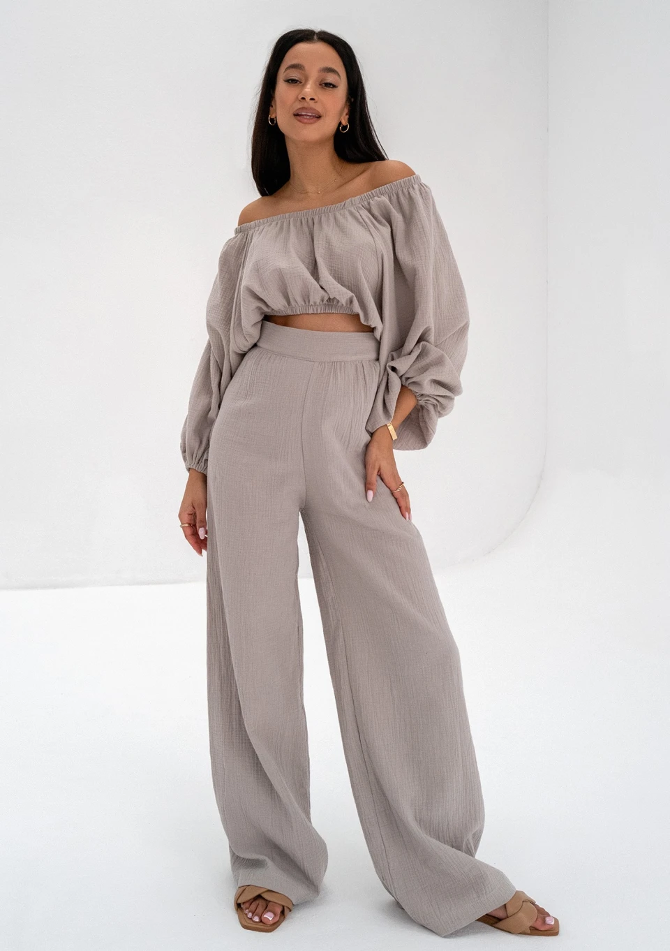 Letnie spodnie damskie w kolorze taupe, z modną szeroką nogawką i wysokim stanem. Zwiewny model wykonany z delikatnego muślinu.