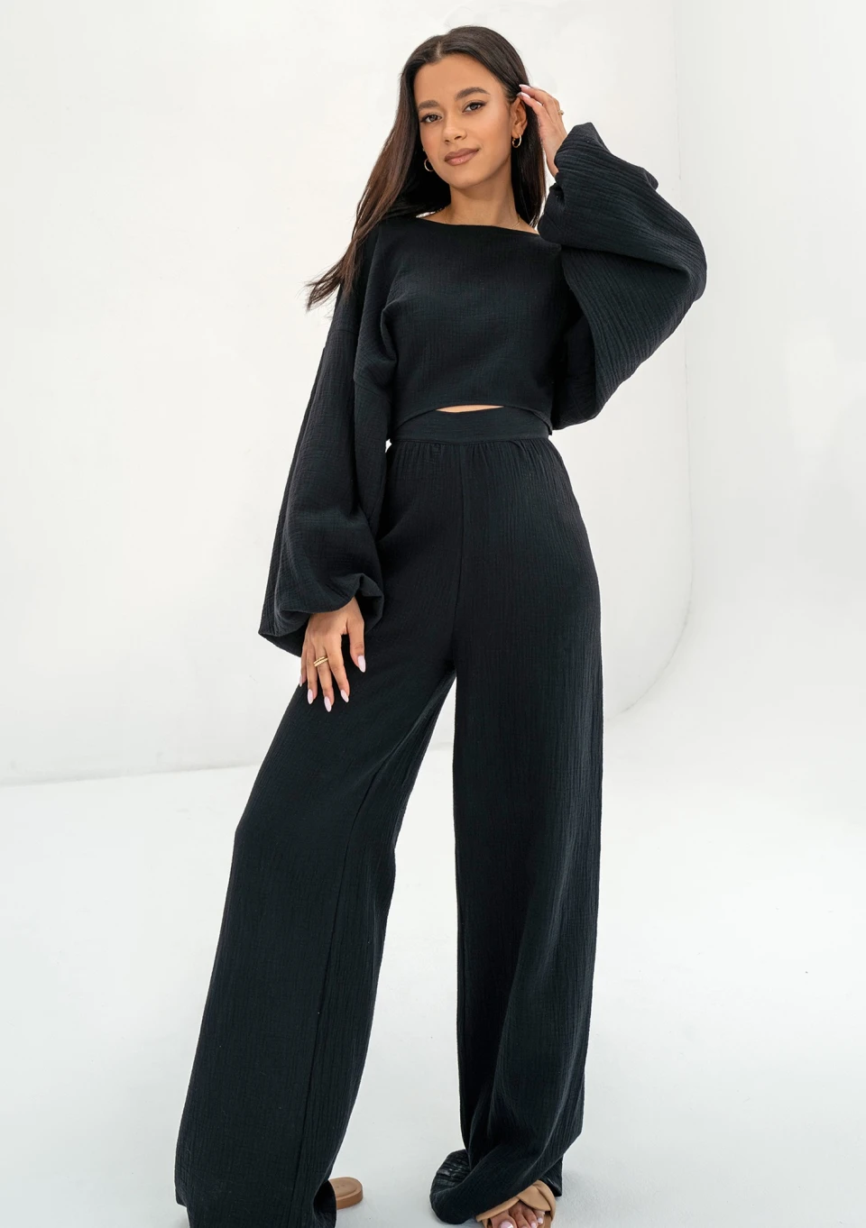 Alines - Szerokie spodnie z muślinu Czarne