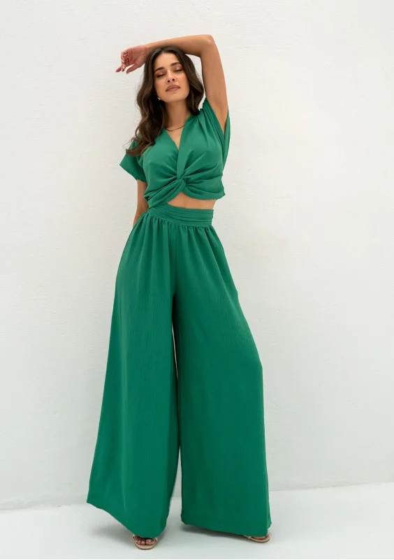 Zwiewne spodnie damskie idealne na każdą letnią okazję, wykonane w niezwykle ożywiającym, zielonym kolorze. Zaprojektowane tak, by zapewniać wysoki przewiew i pełen fantazyjnej lekkości szyk boho. Uszyte z lekkiego, oddychającego materiału, gwarantują elegancki wygląd i maksymalny komfort noszenia. Doskonale dopasowują się do sylwetki w talii, oferując swobodę ruchów i stylowy wygląd na każdym spotkaniu, od casualowych spacerów po eleganckie wieczory. Modelka Andżelika prezentuje je w połączeniu z dedykowanym topem Musso, tworząc spójną i modną stylizację.