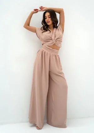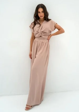 Beżowe, zwiewne spodnie damskie na każdą, letnią okazję. Zostały zaprojektowane tak, aby gwarantowały wysoki przewiew i lekko unoszącą się formę boho. Wykonane z lekkiego, przepuszczającego powietrze materiału, zapewniają nie tylko elegancki wygląd, ale także maksymalny komfort noszenia. Doskonale dopasowują się do ciała w talii, oferując swobodę ruchów i stylowy wygląd na każdym spotkaniu. Modelka Andżelika prezentuje je na sobie z dedykowanym topem o tej samej nazwie Musso.