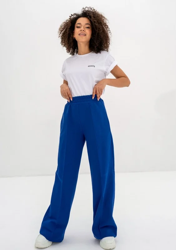 Kobaltowe spodnie dresowe z miękkiej dzianiny bawełnianej. Prosty model, z najmodniejszą, szeroką nogawką i kieszeniami.