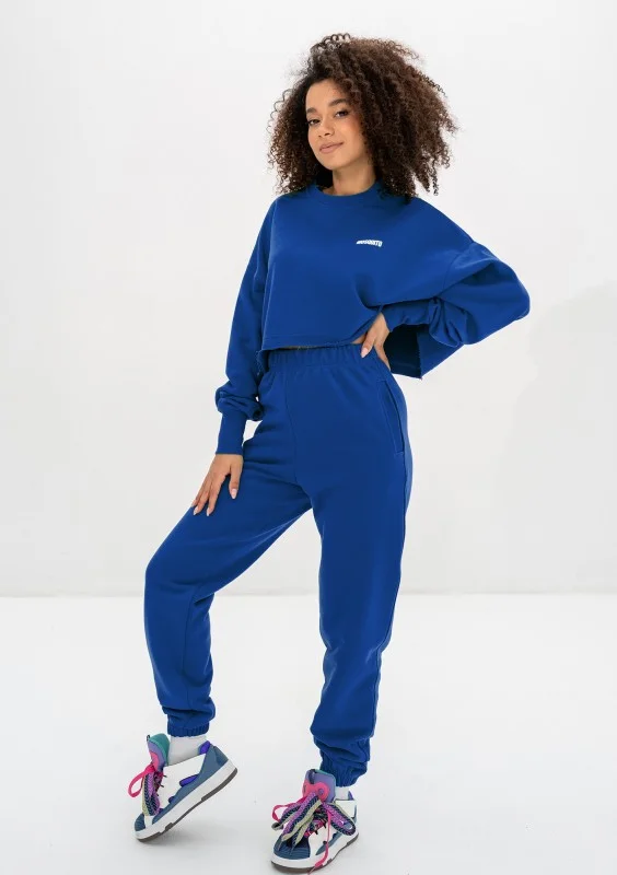 Wygodne spodnie dresowe damskie o luźnym kroju, wykonane w intensywnym, kobaltowym kolorze. Białe logo Mosquito zostało umieszczone z tyłu.