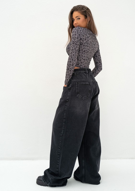 Wyjątkowe jeansy damskie z wygodną regulacją obwodu w talii. Modny fason z szerokimi nogawkami to najważniejszy trend sezonu! Spodnie są wykonane w czarnym kolorze.