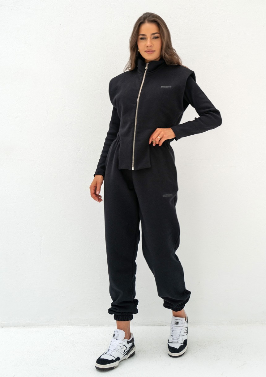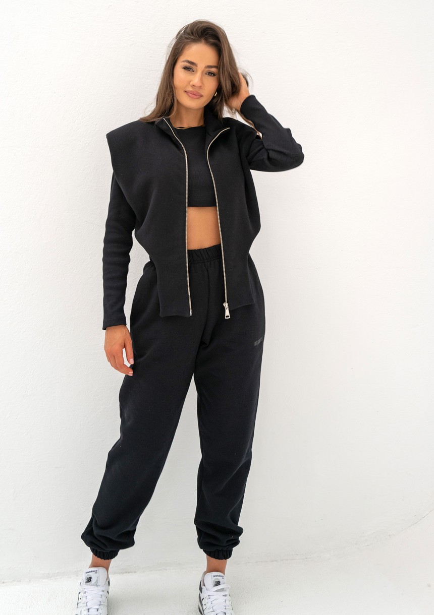 Czarne spodnie dresowe o luźnym kroju, wykończone ściągaczami i praktycznymi kieszeniami. Logo w tym modelu jest czarne.
